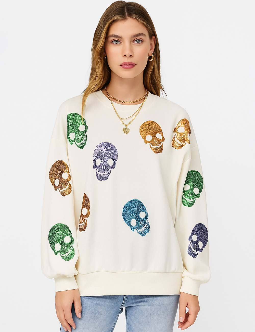 Ladies Halloween Sequin Skull Round Neck Long Sleeves Sweatshirt