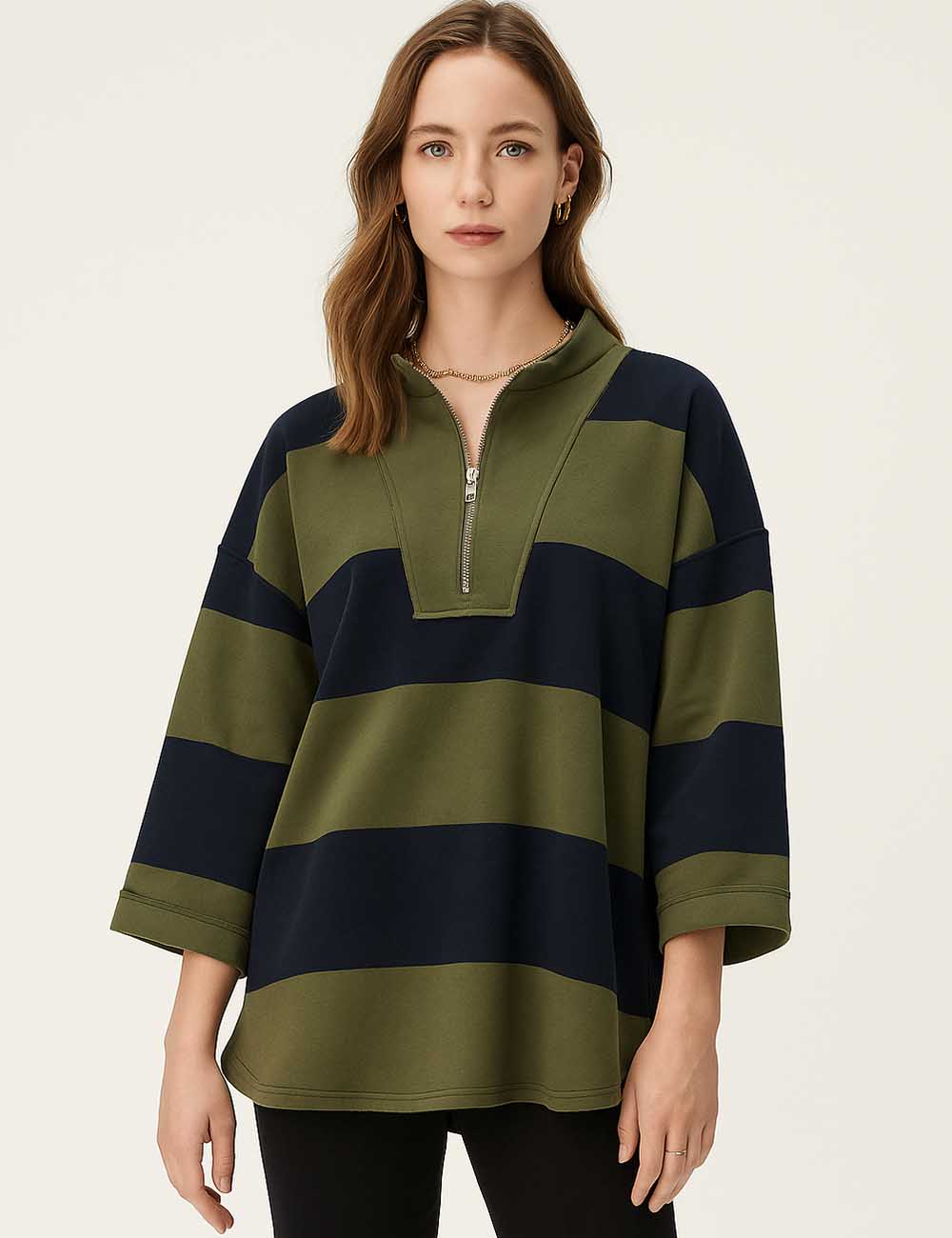 Ladies Color Block Stripe Lapel Pullover Top Everyday Sweatshirt