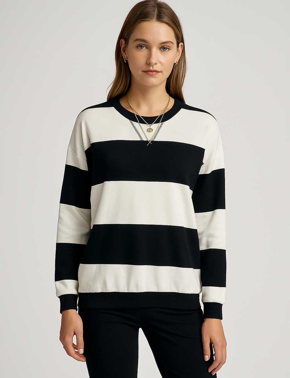 Ladies Round Neck Pullover Striped Long Sleeves Sweatshirt
