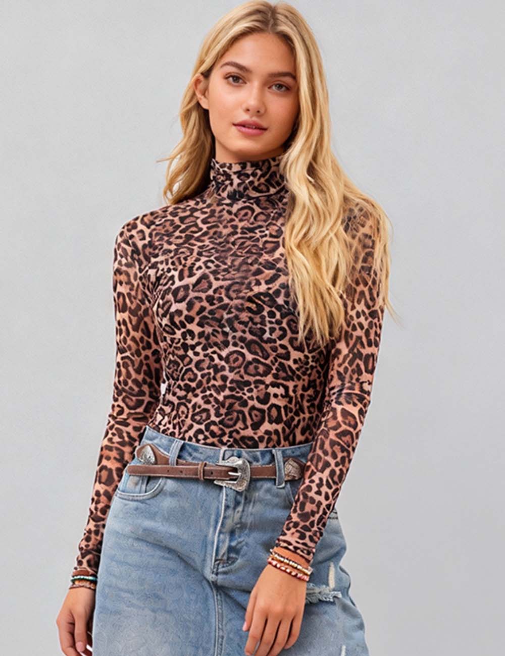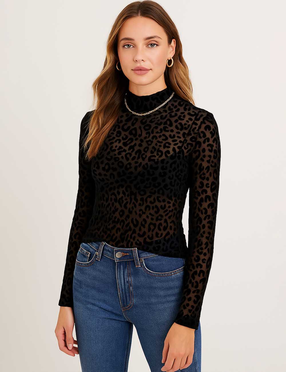 Ladies See Sheer Pullover Blouse Leopard Mesh Layring Top SKT4947
