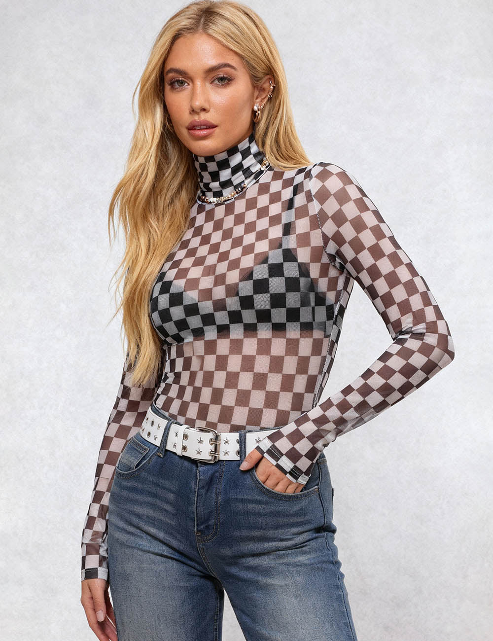 Ladies See Sheer Bodysuit Grid Mesh Layring Top SKT4935