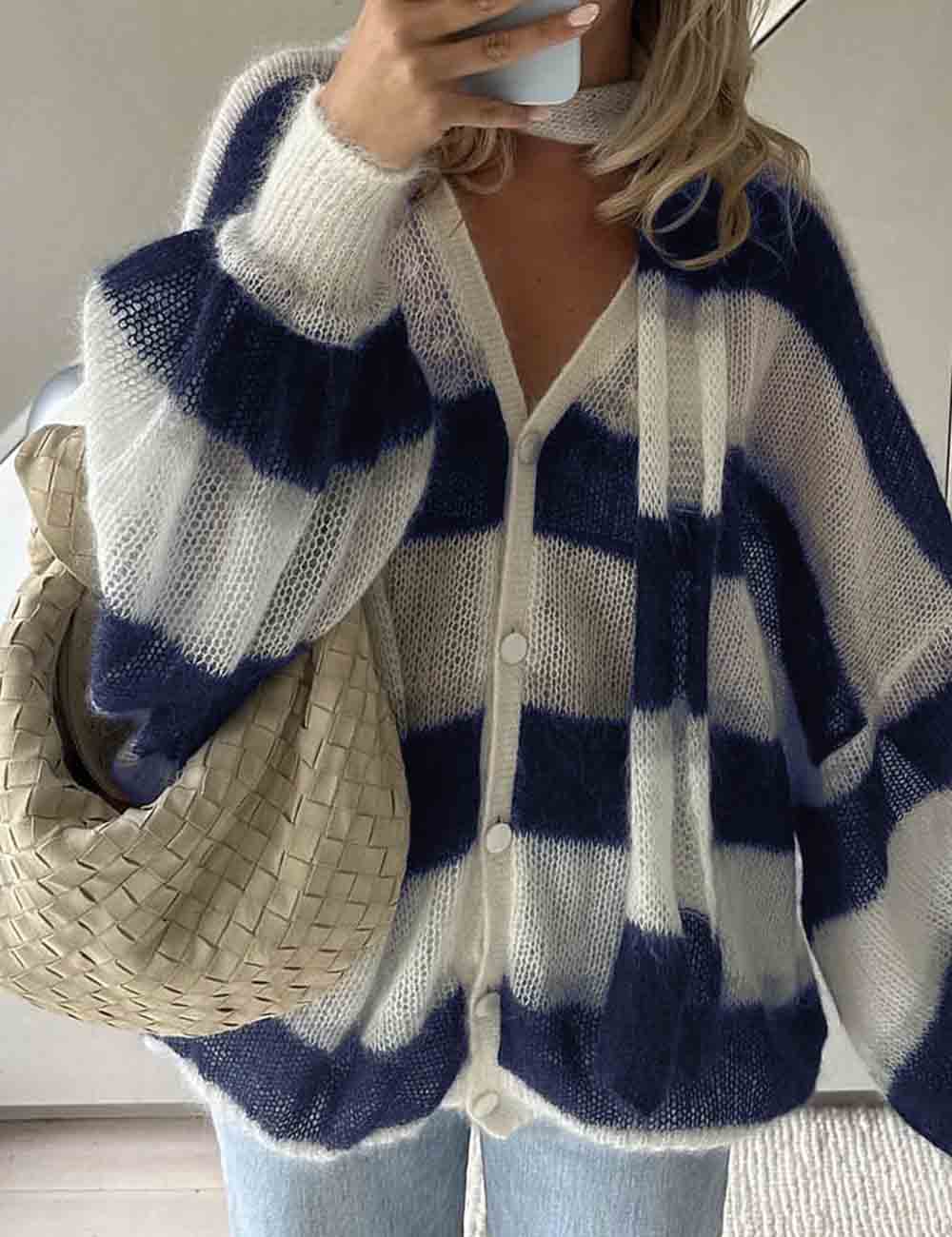 Ladies V-Neck Color Block Striped Lantern Sleeves Knit Cardigan