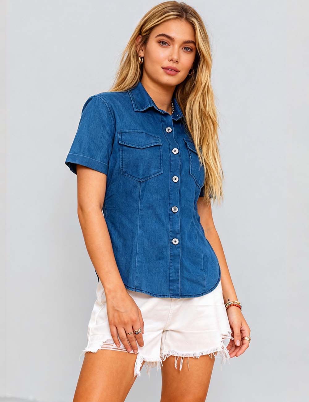 Features: * Ladies Denim Shirt * Polyester and Cotton * Fabric No Stretch * Color...