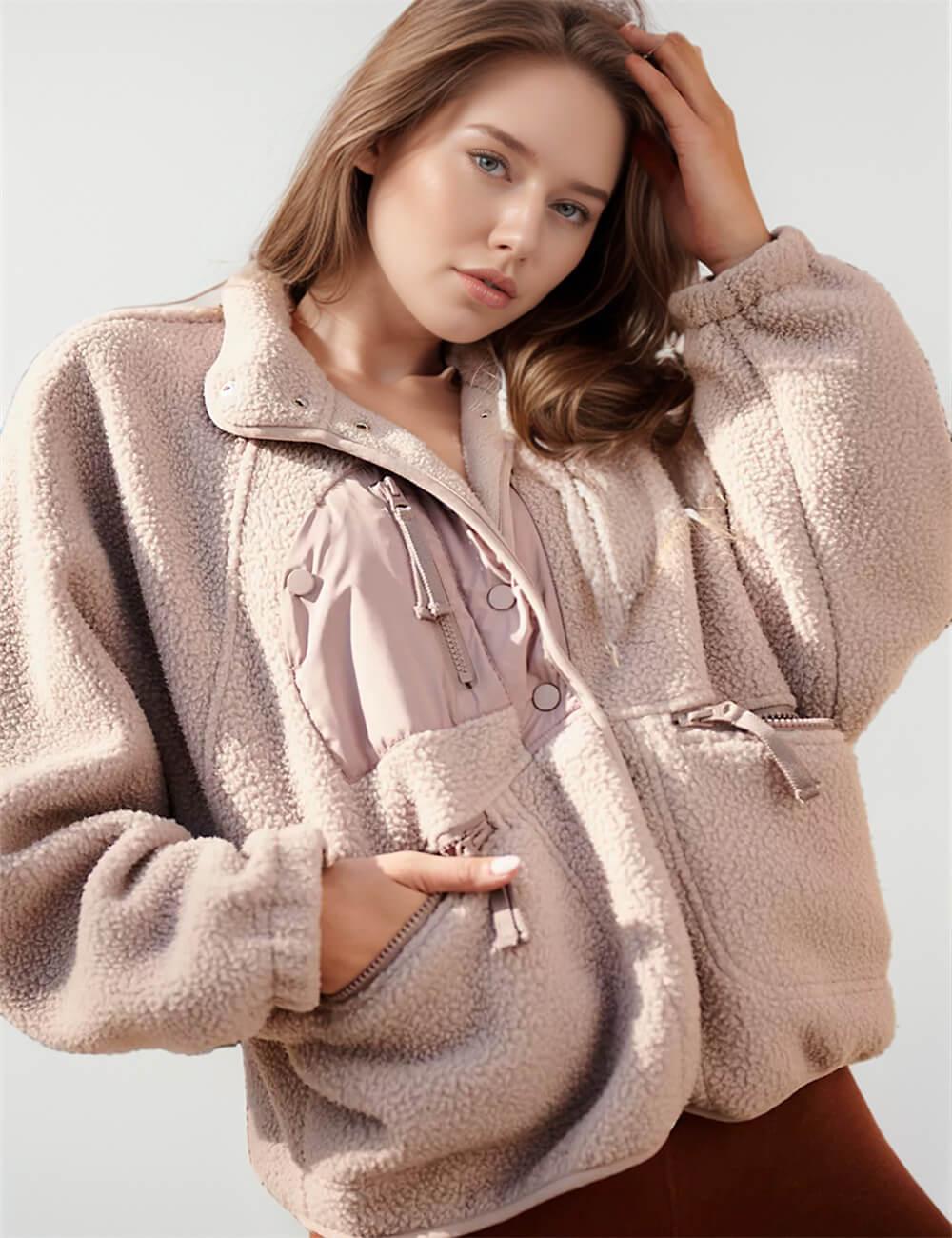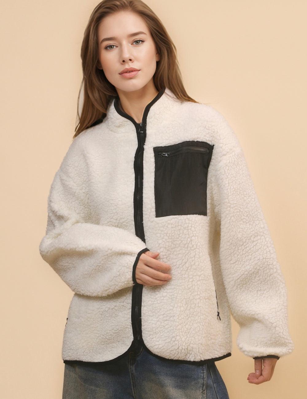 Ladies Color Block Fleece Coat Button Closure Patch Pocket Jacket