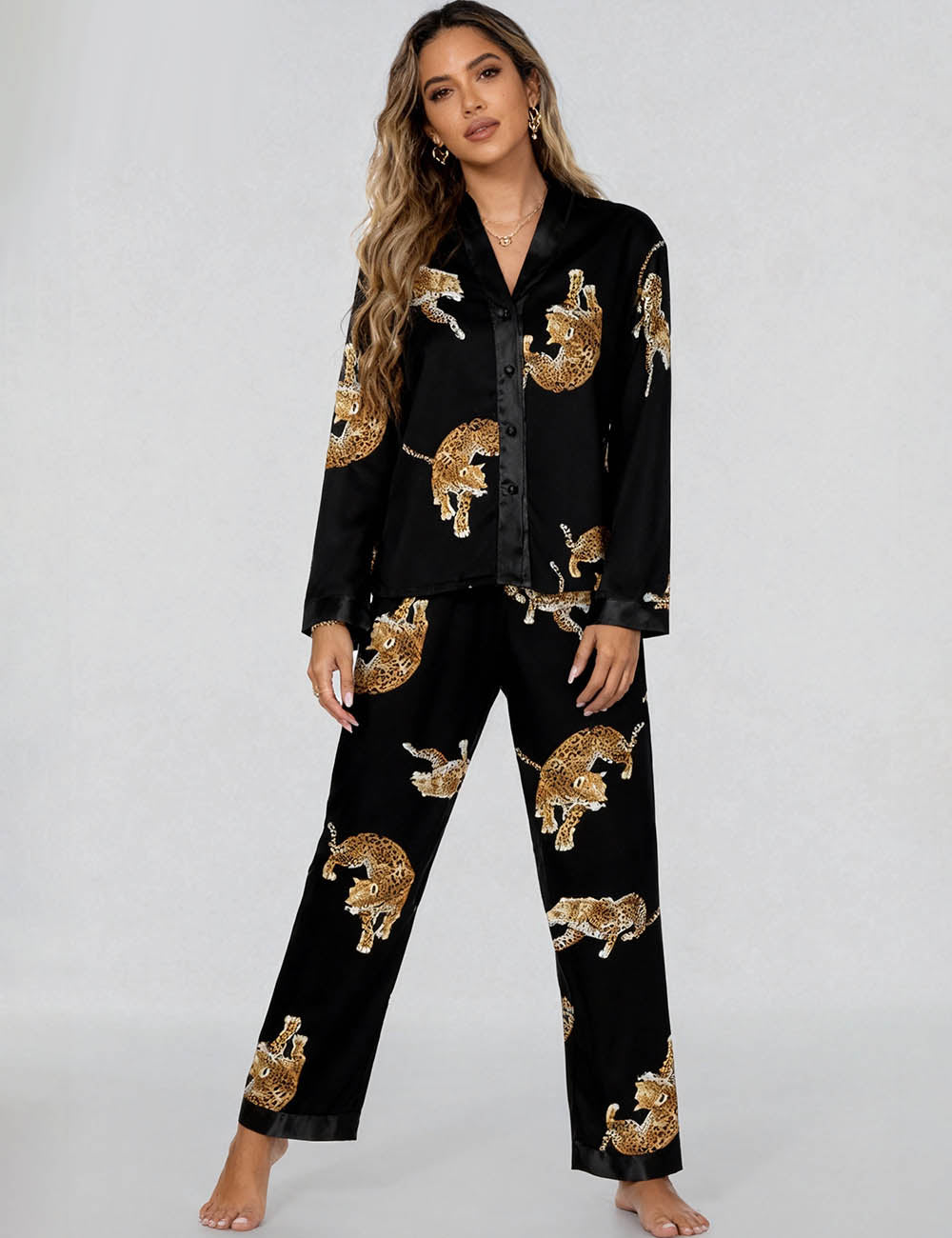 Ladies Animal Print Lounge Set Lapel Collar Shirt & Pants 2PCS Set