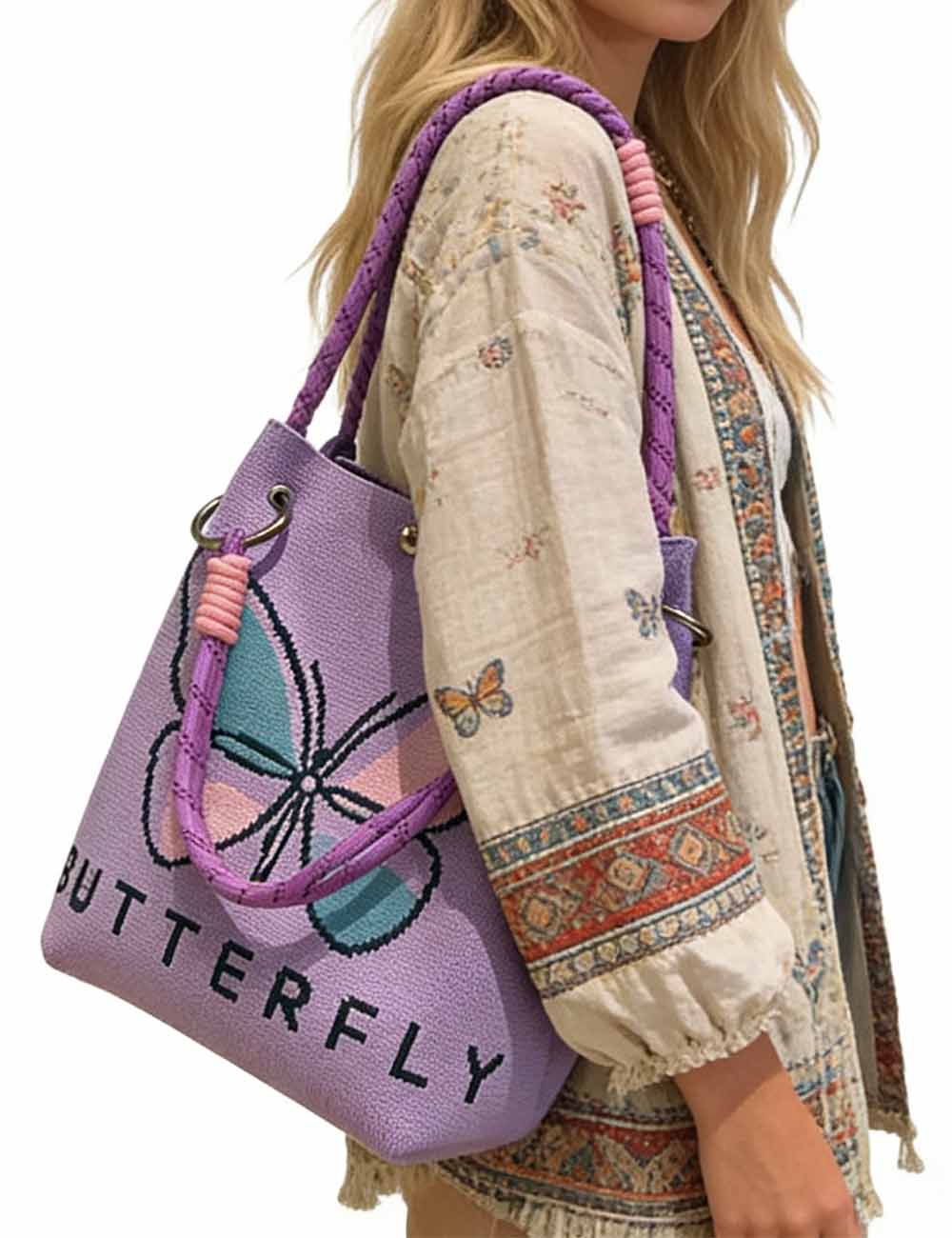Ladies Butterfly Knit Multi-Color Rope Handle Bucket Bag