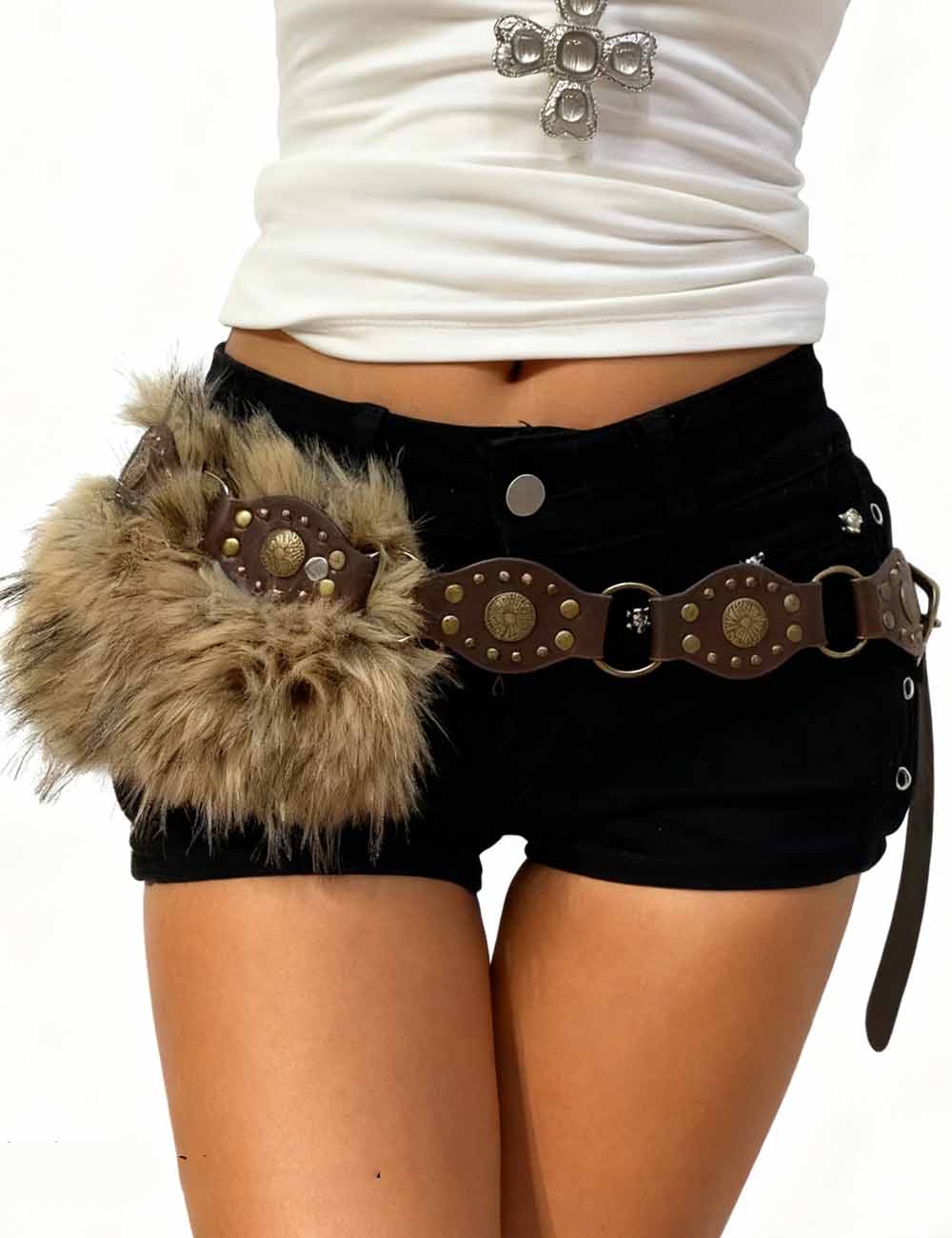 Ladies Fluffy Plush Studded Cincher Faux Fur Waist Belt