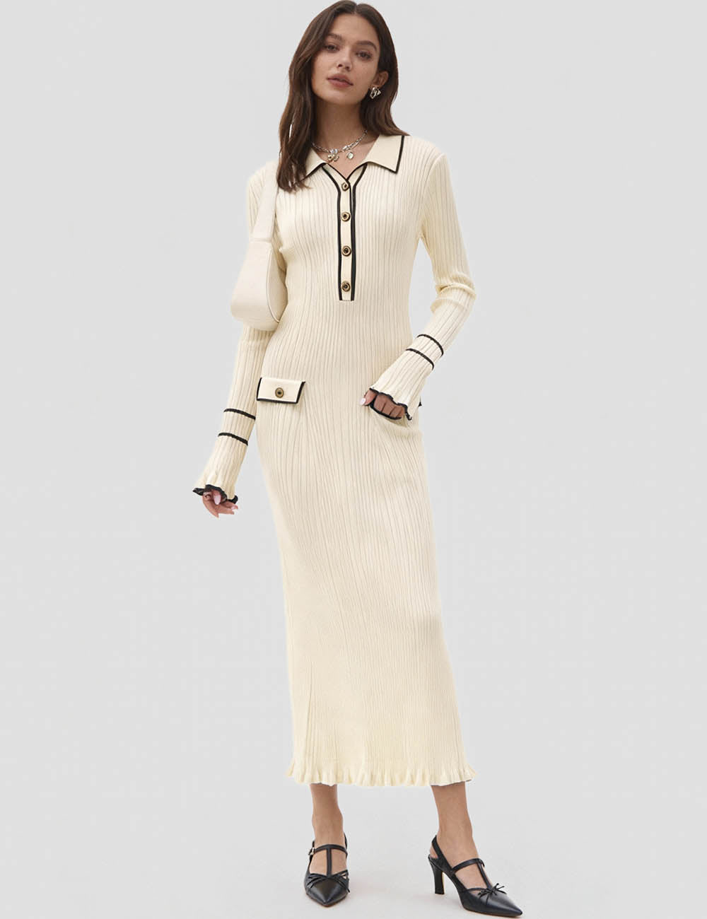 Ladies Turndown Collar Bell Long Sleeves Knit Maxi Dress