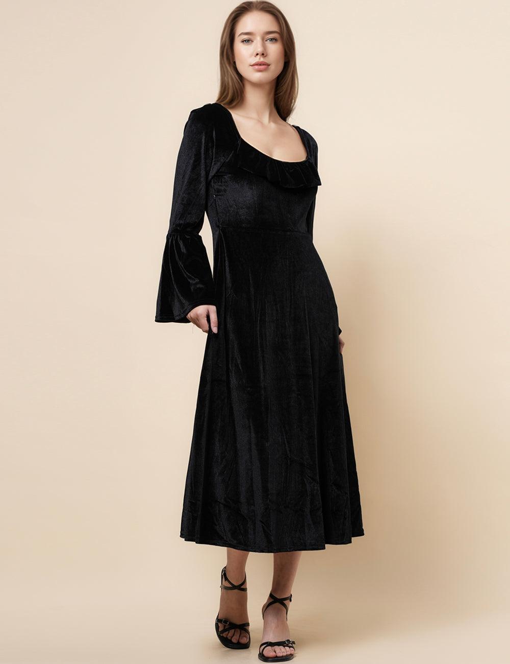 Ladies Elegant Velvet Square Neck Ruffle Sleeves Midi Dress SKD4900