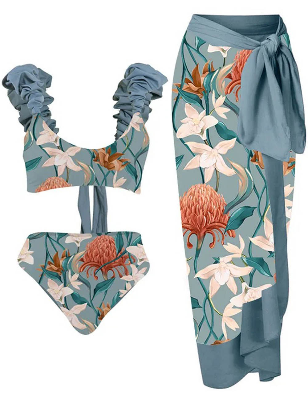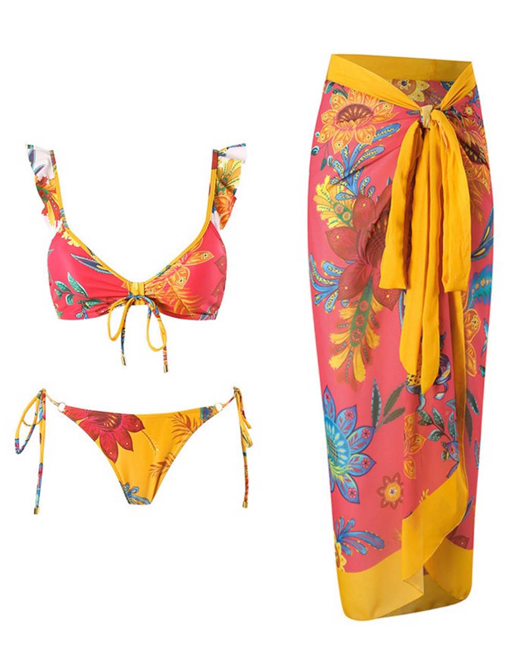 Ladies 3-Piece Floral Print Bikini Swimsuits with Cover Up Y129