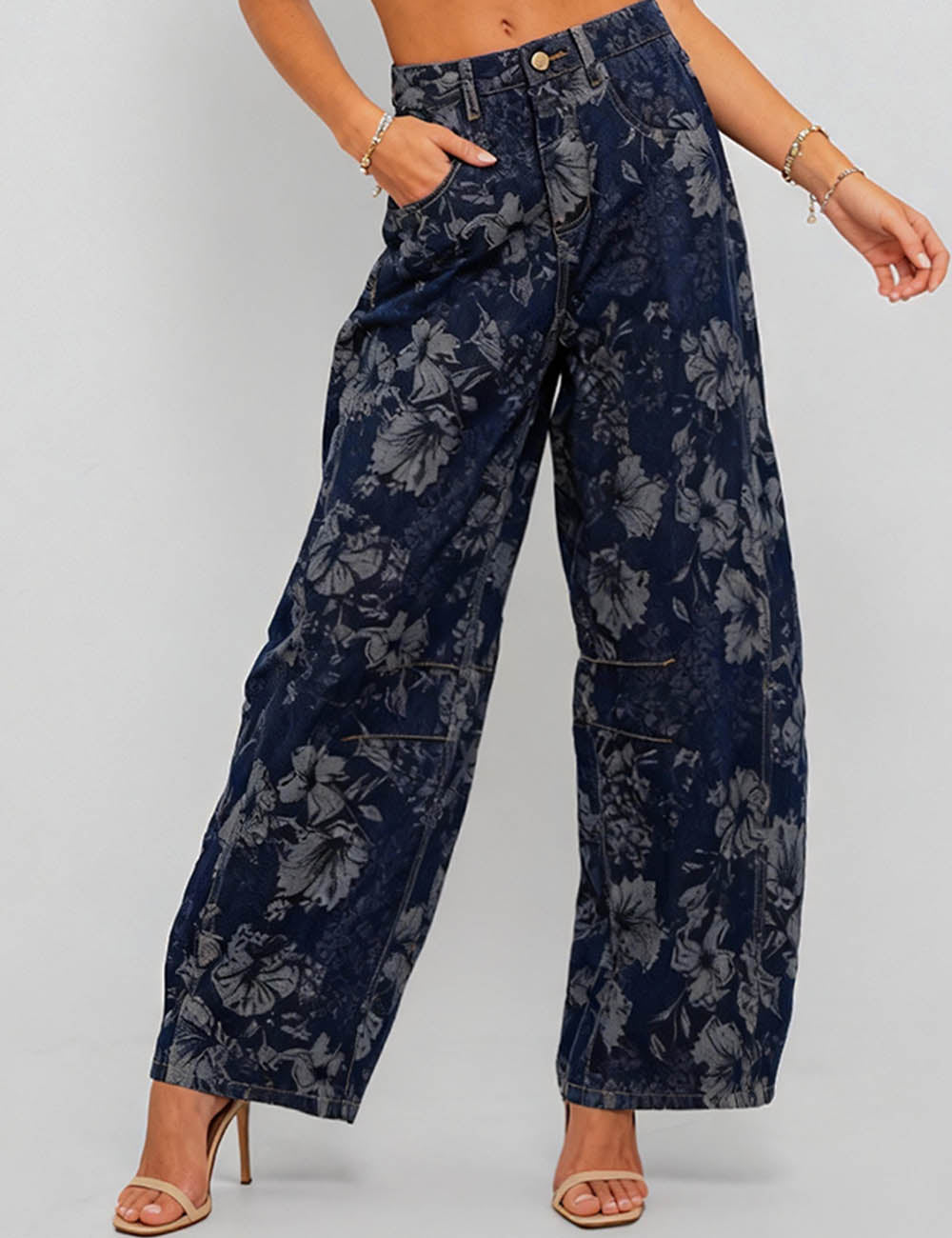 Ladies Vintage Denim Pants Floral Print Barrel Pants