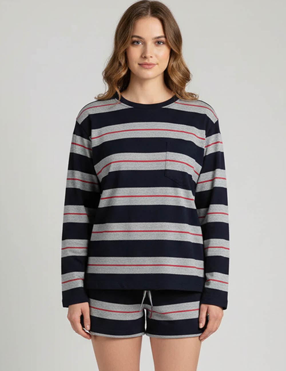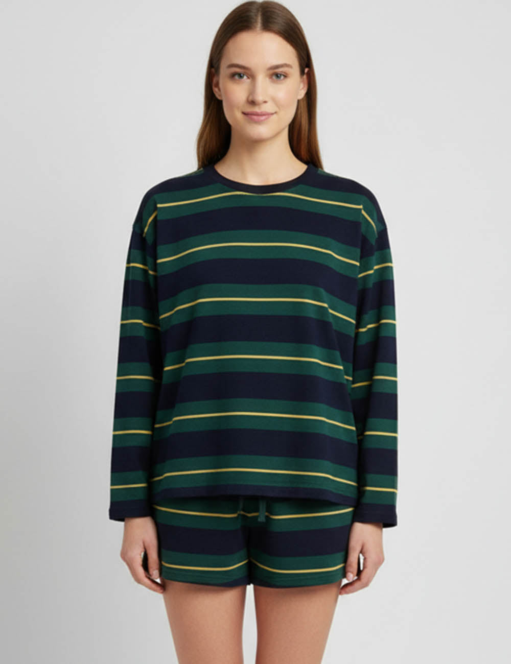 Ladies Polo Collar Striped Long Sleeves Sweatshirt & Shorts Set