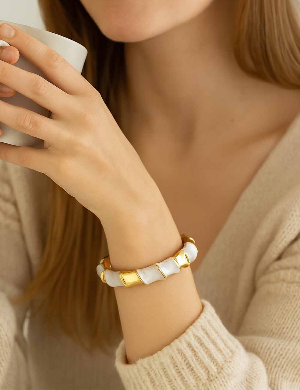 Features: * Ladies Bangle * Plated Alloy * Color Block * Gold and White Patterned...