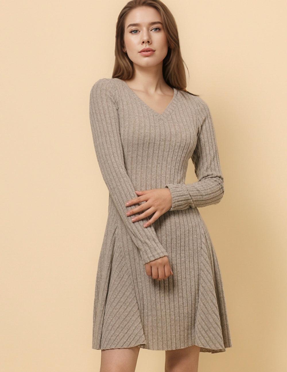 Ladies Solid Color V-neck Knit Ribbed Mini Dress SKD4768