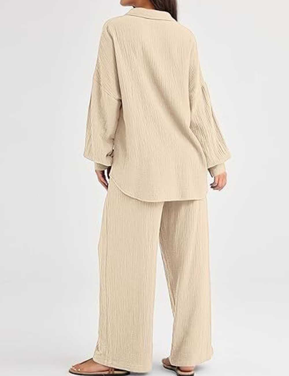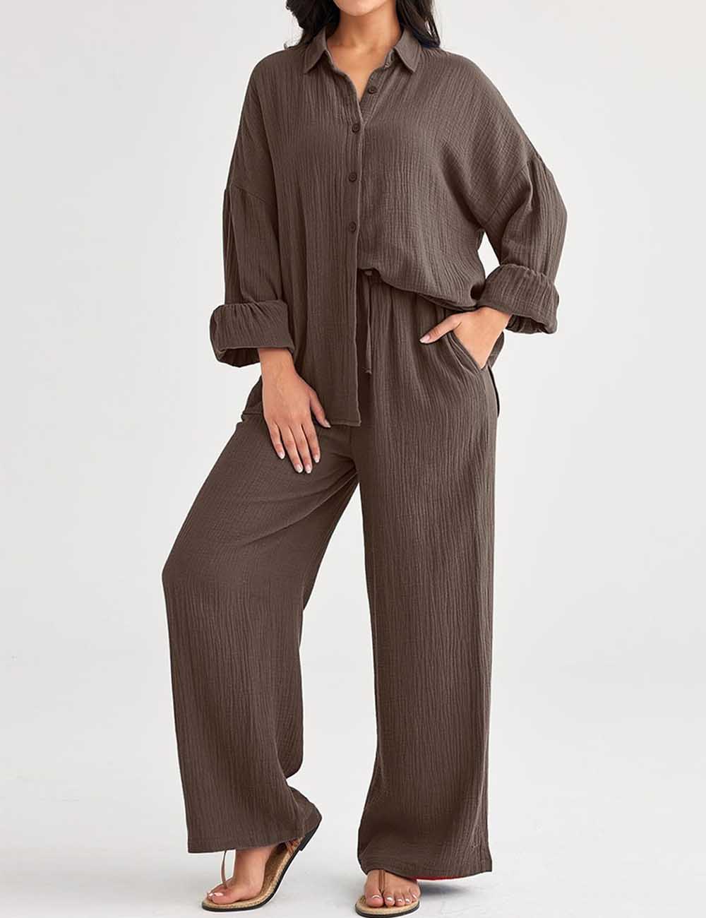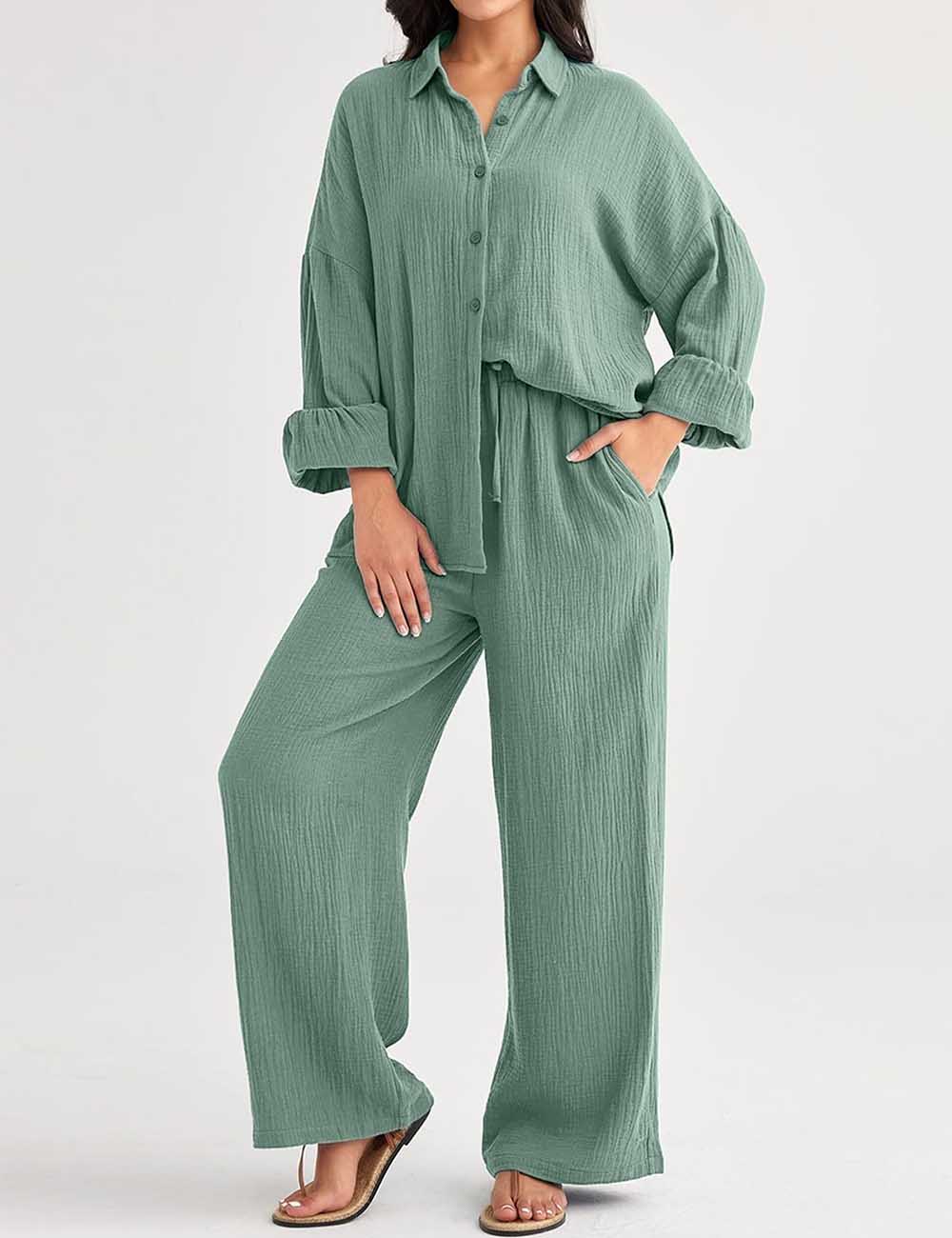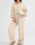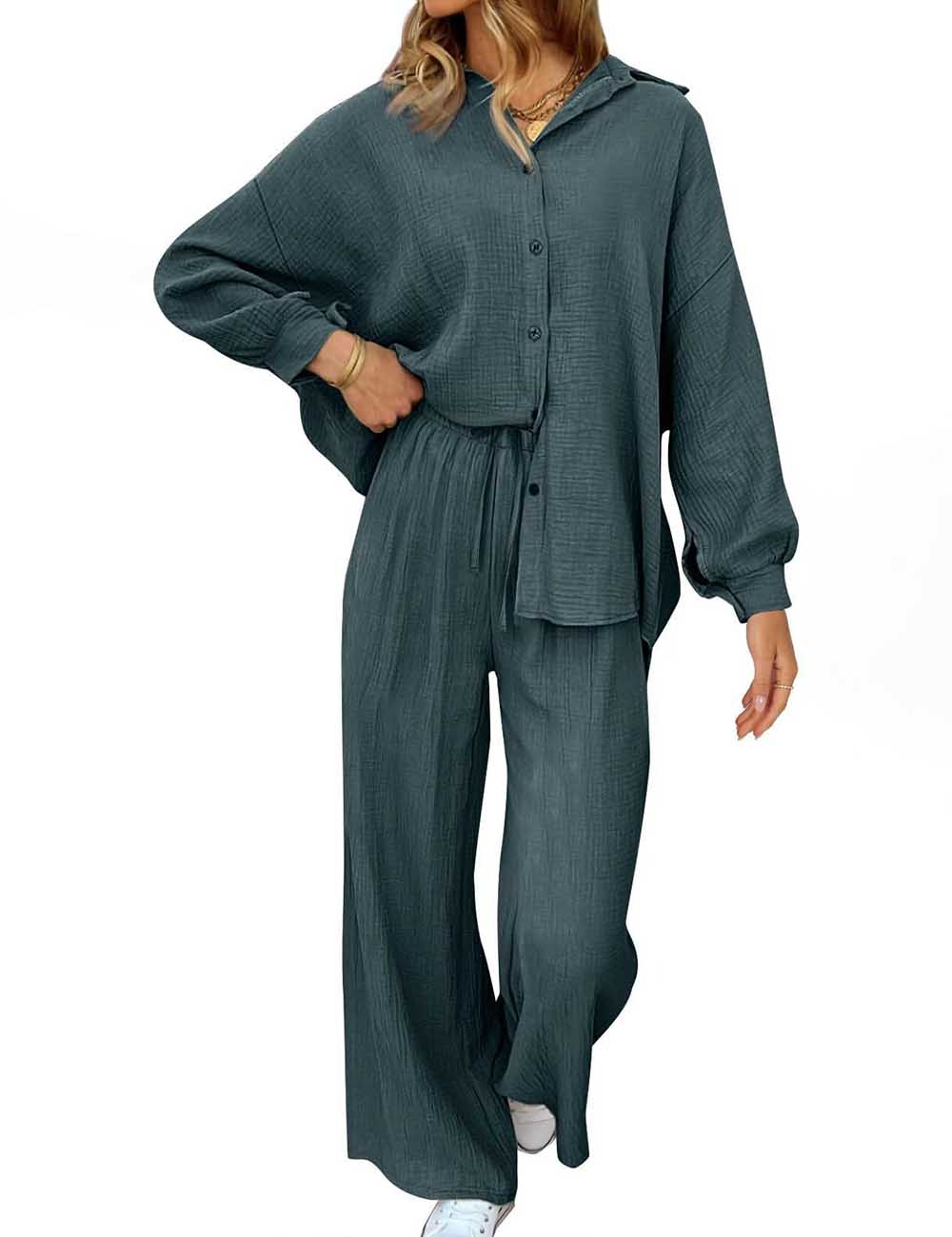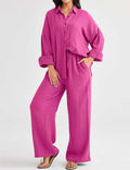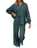 Ladies Solid Color Button Down Long Sleeves Shirt & Pants Set