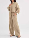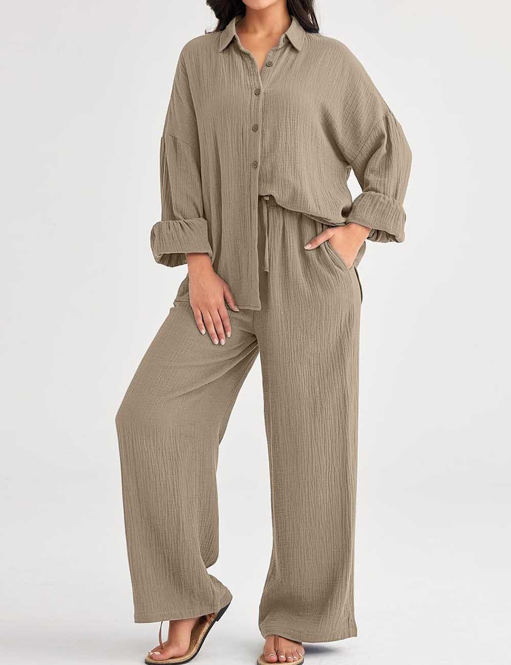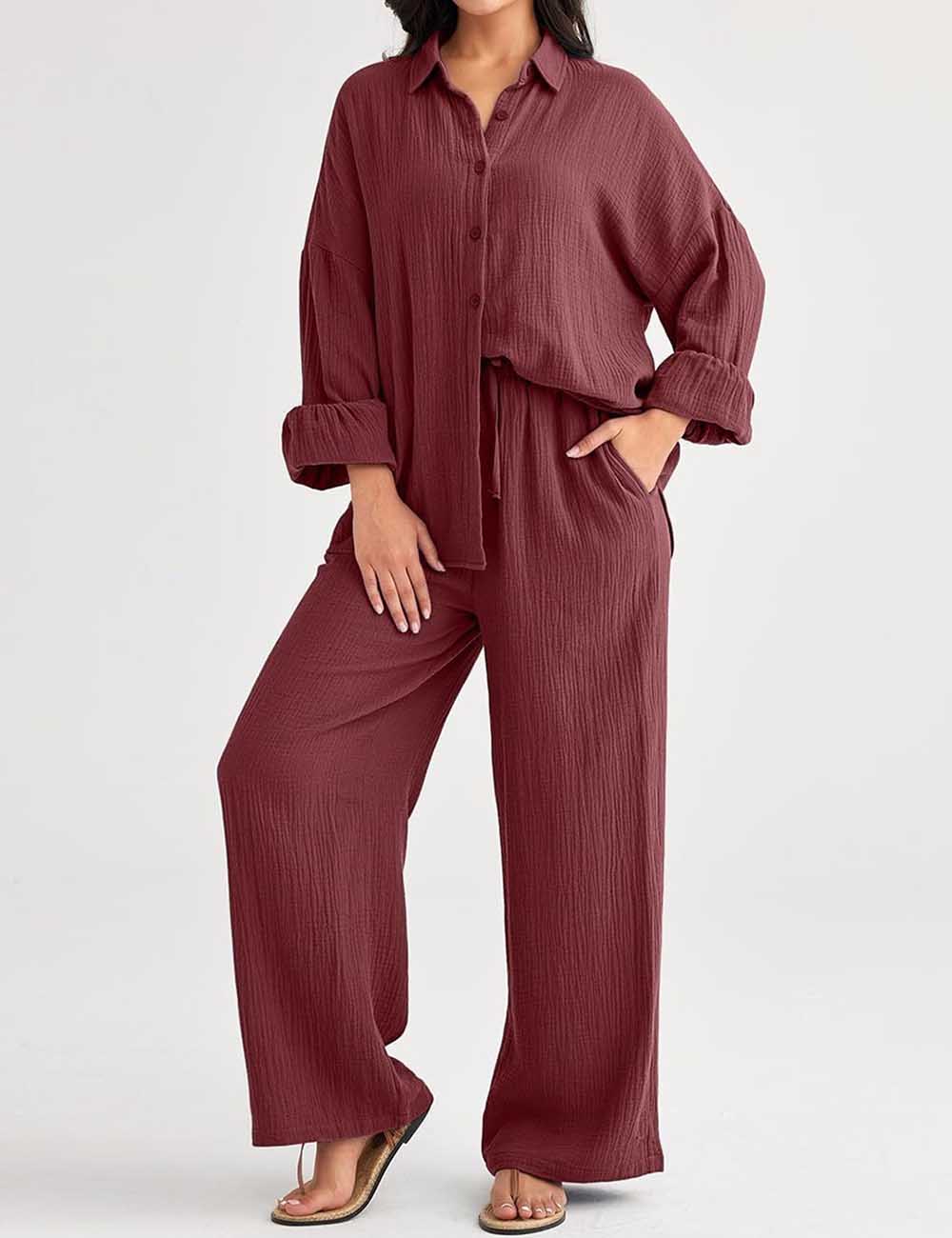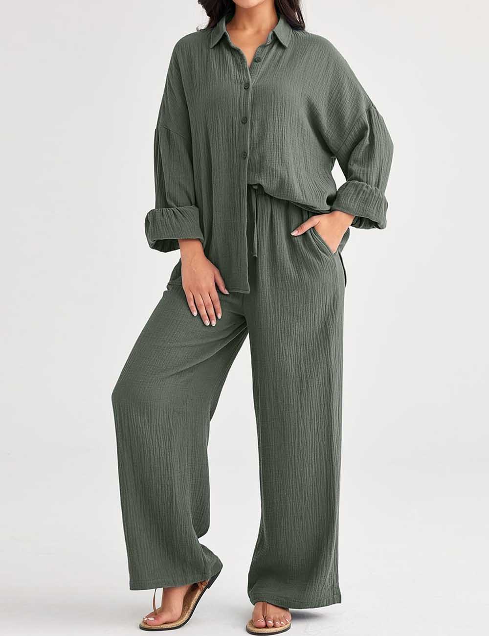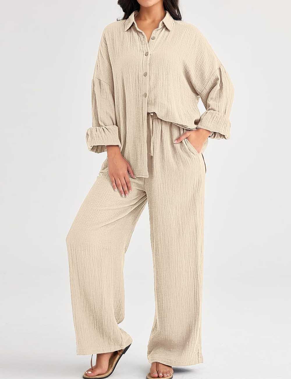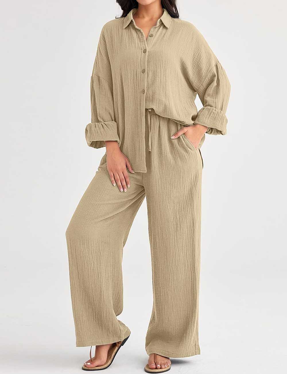 Ladies Solid Color Button Down Long Sleeves Shirt & Pants Set