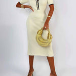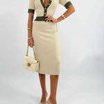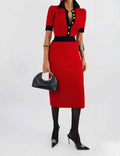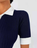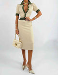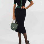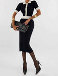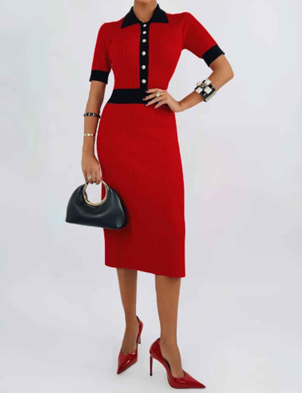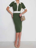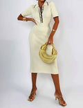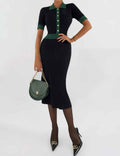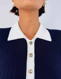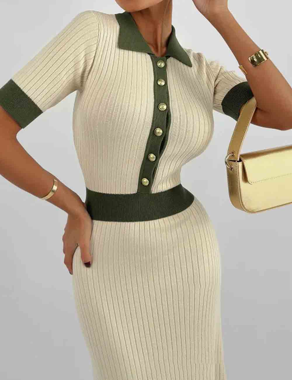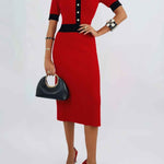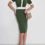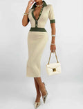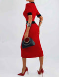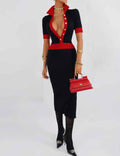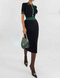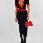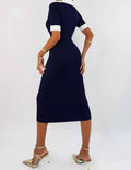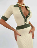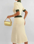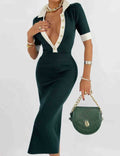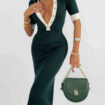 Ladies Color Block Knit Lapel Collar Short Sleeves Midi Dress