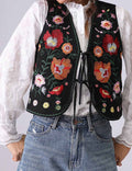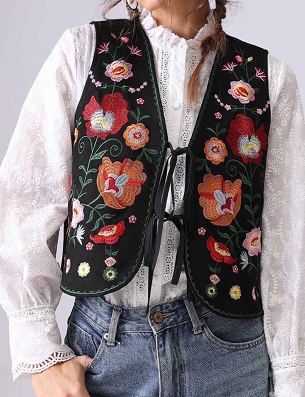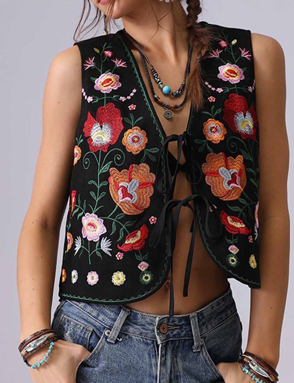 Ladies Floral Embroidery String Tie Sleeveless Vest Top