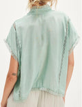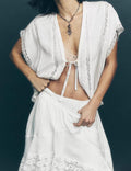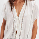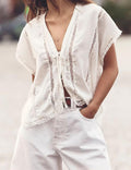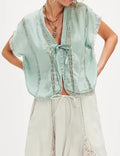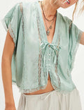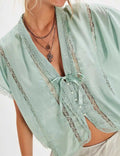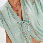 Ladies Solid Color Lace Hollow Out String Tie Blouse