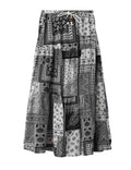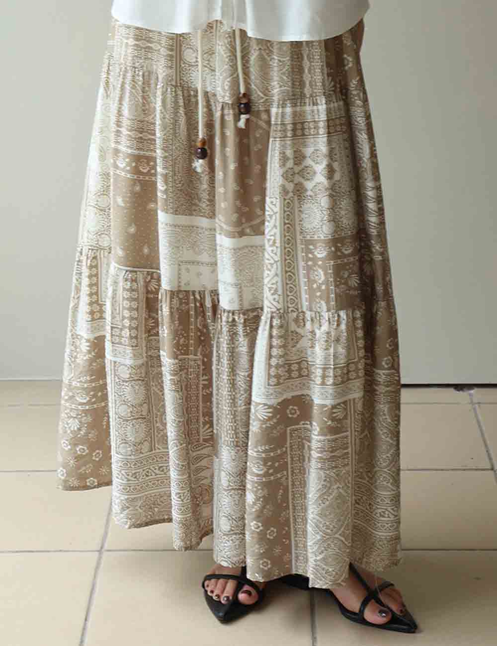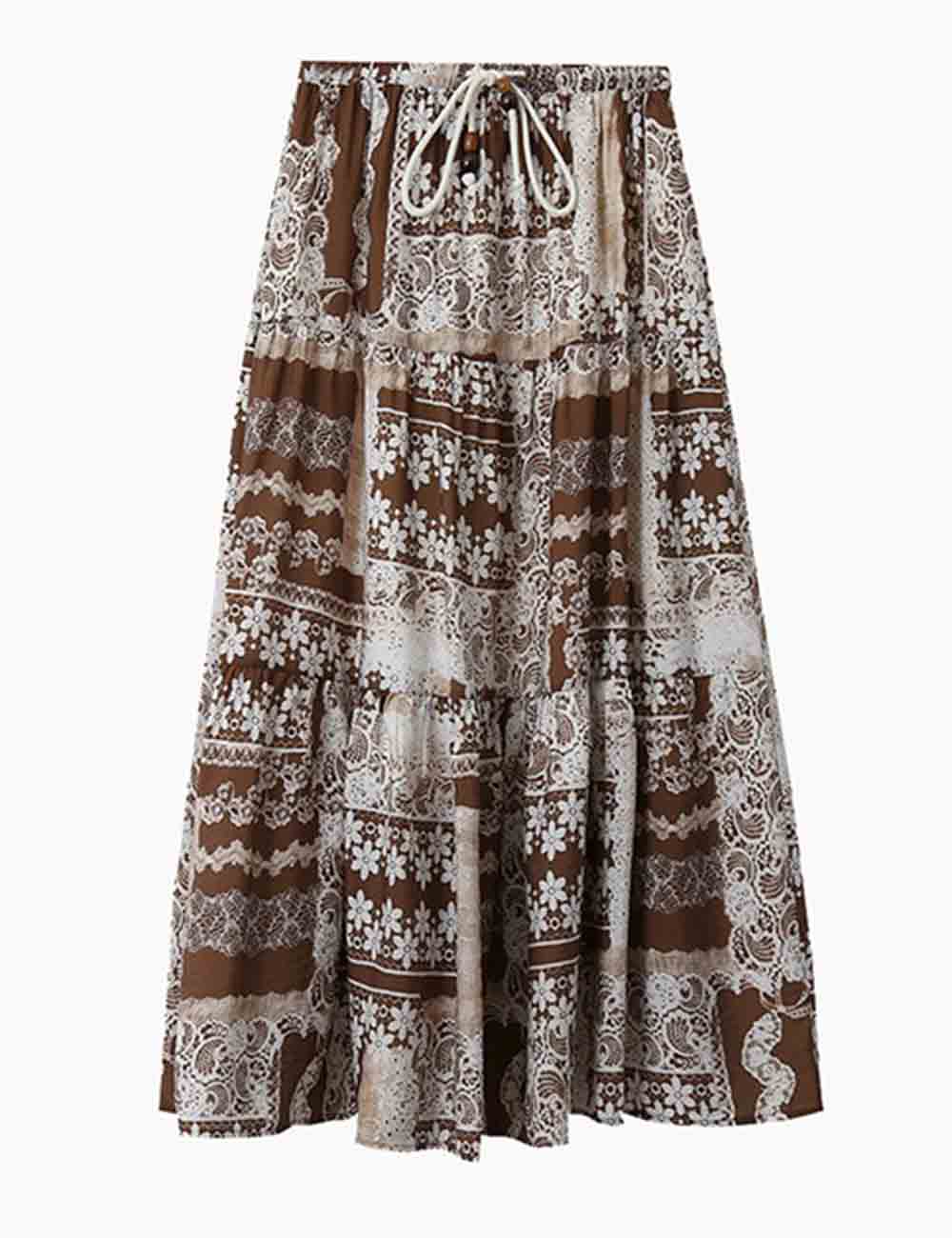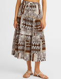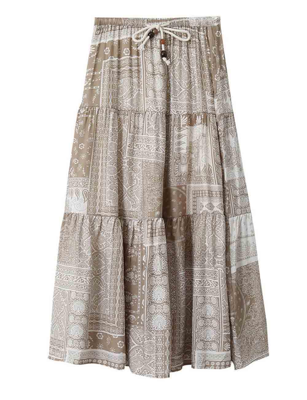 Ladies Boho Abstract Print String Tie Tiered Midi Skirt