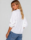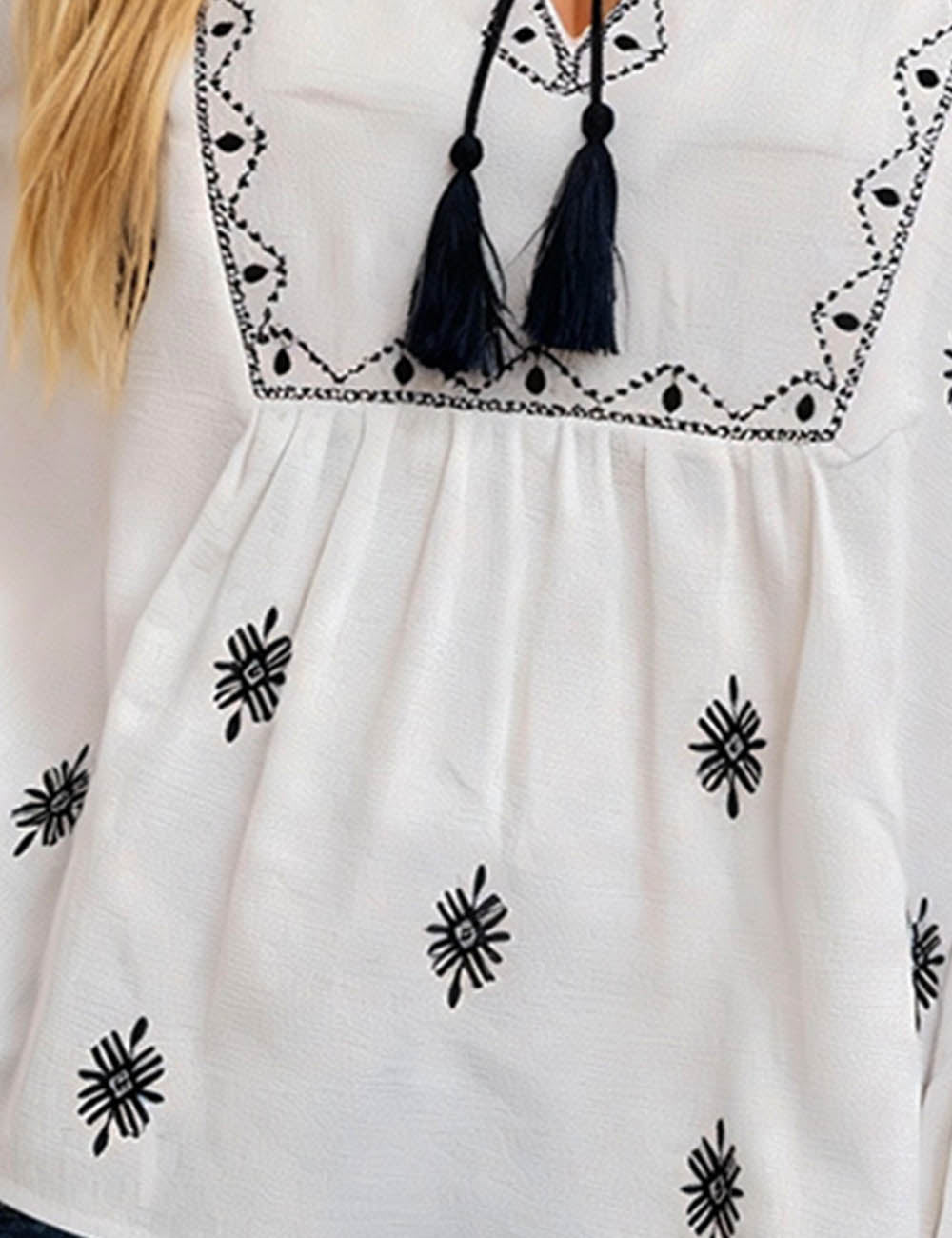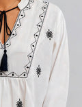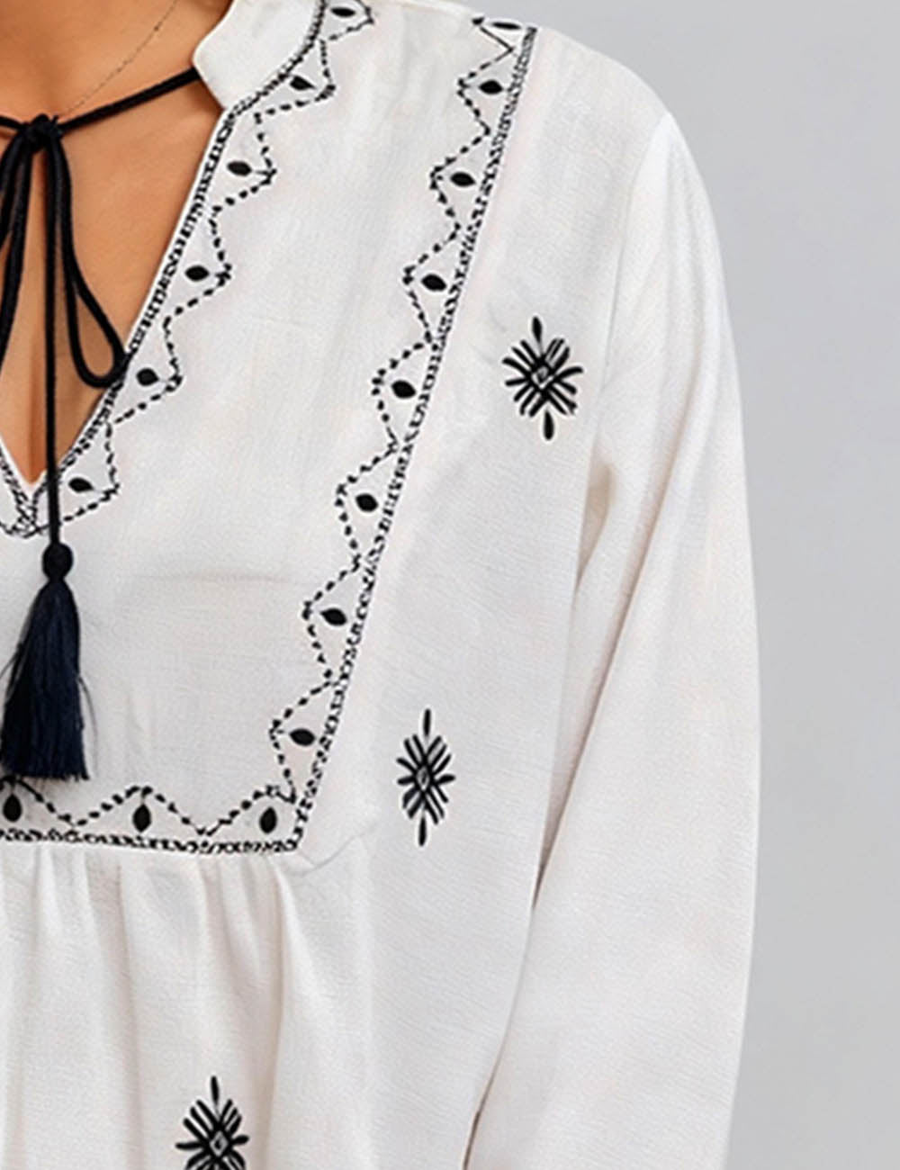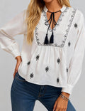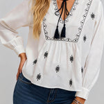 Ladies Boho Embroidery Top Tassel Tie Long Sleeves Blouse