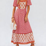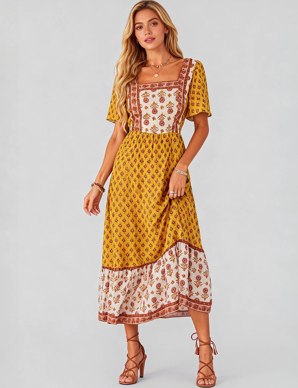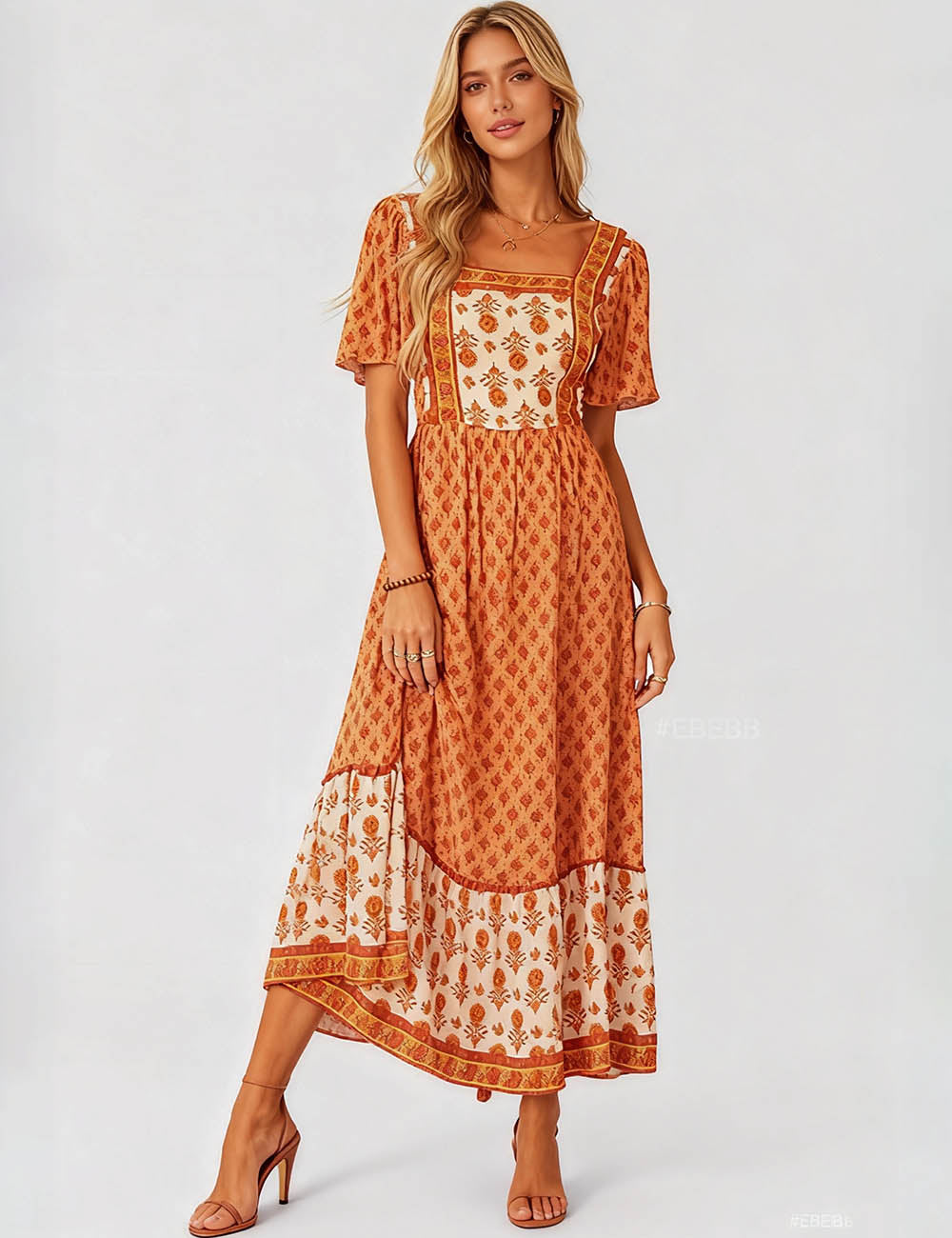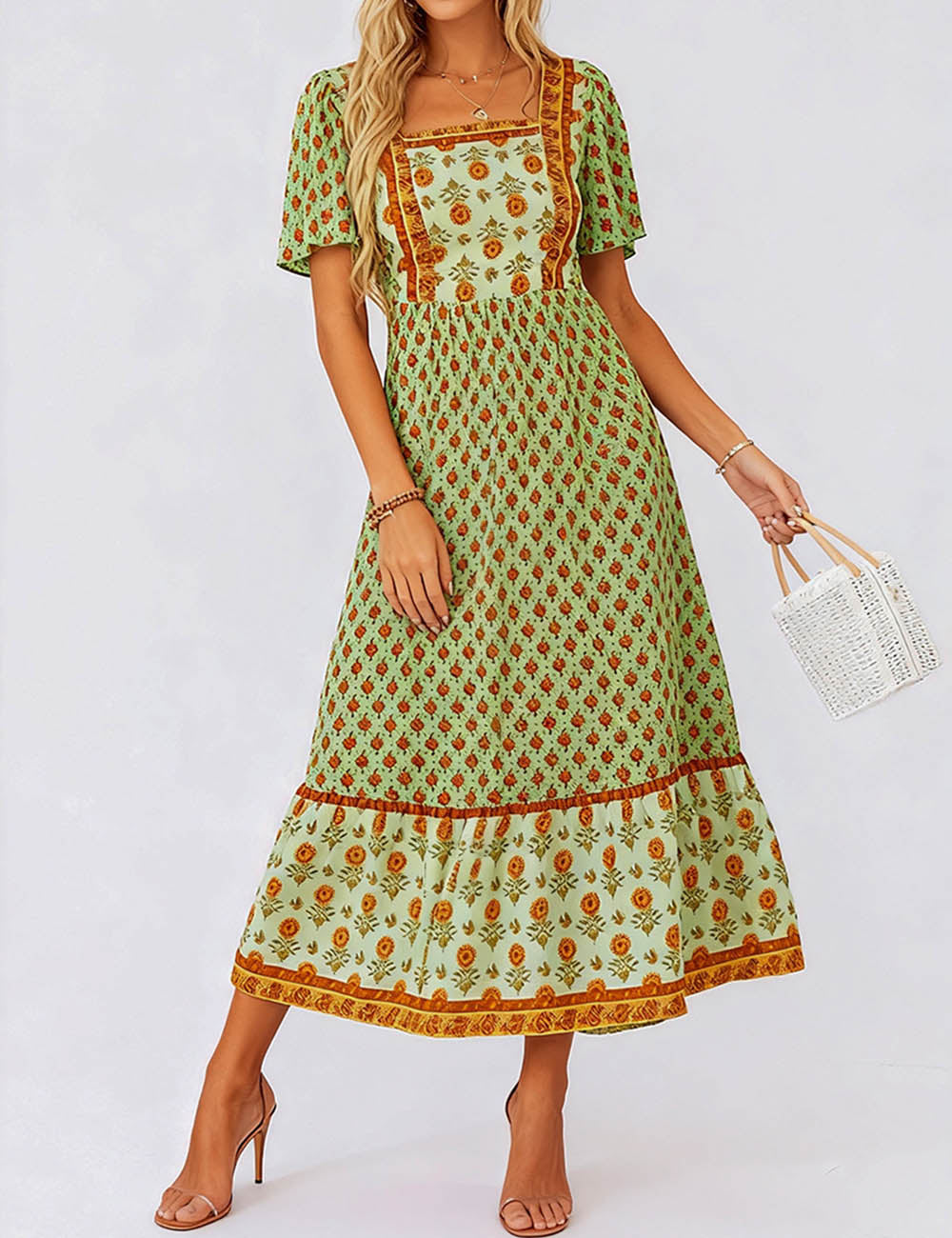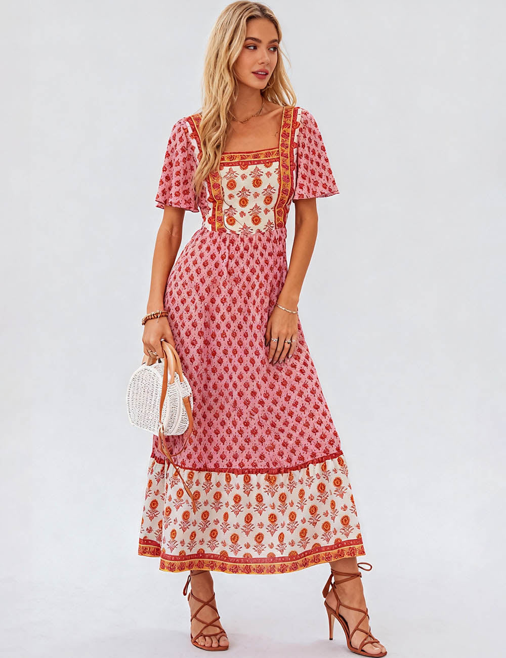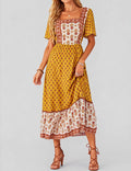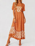 Ladies Boho Floral Print Square Neck Short Sleeves Maxi Dress