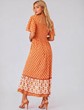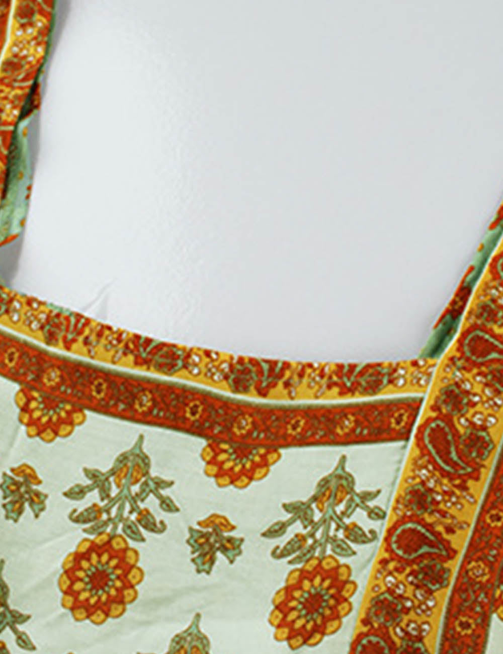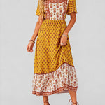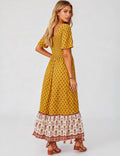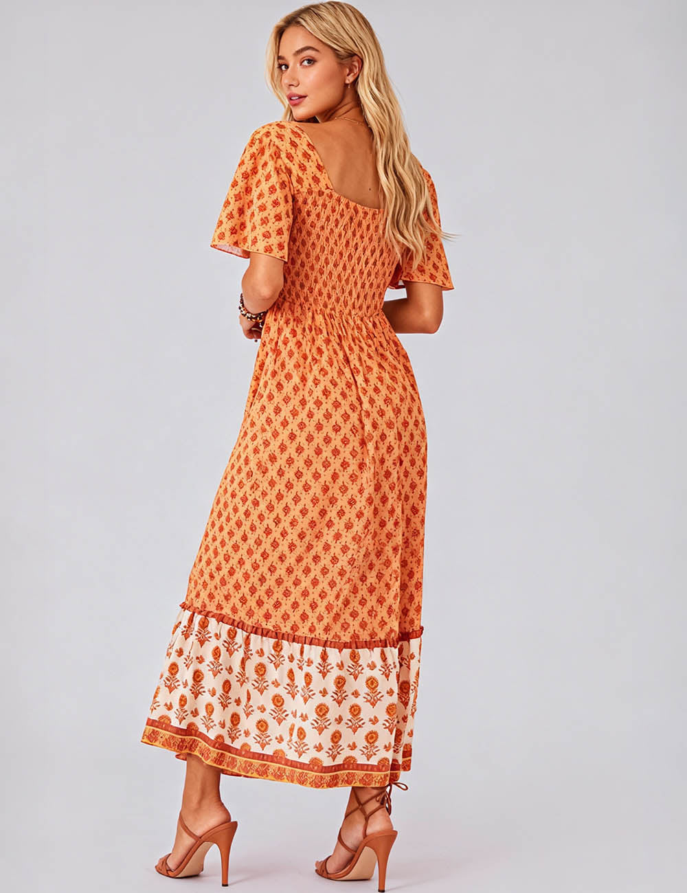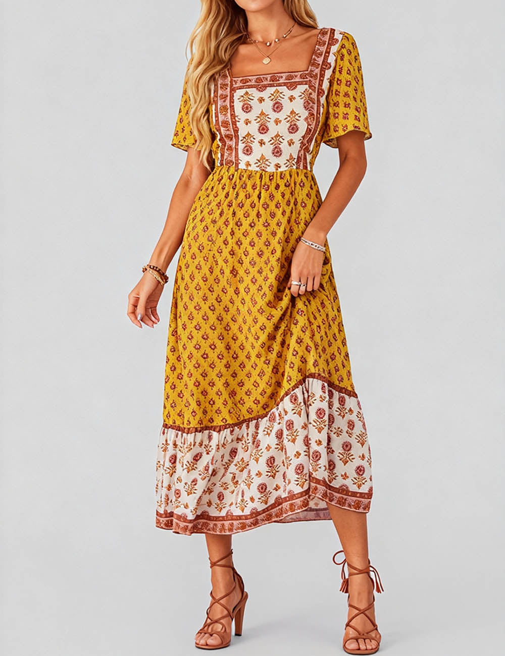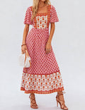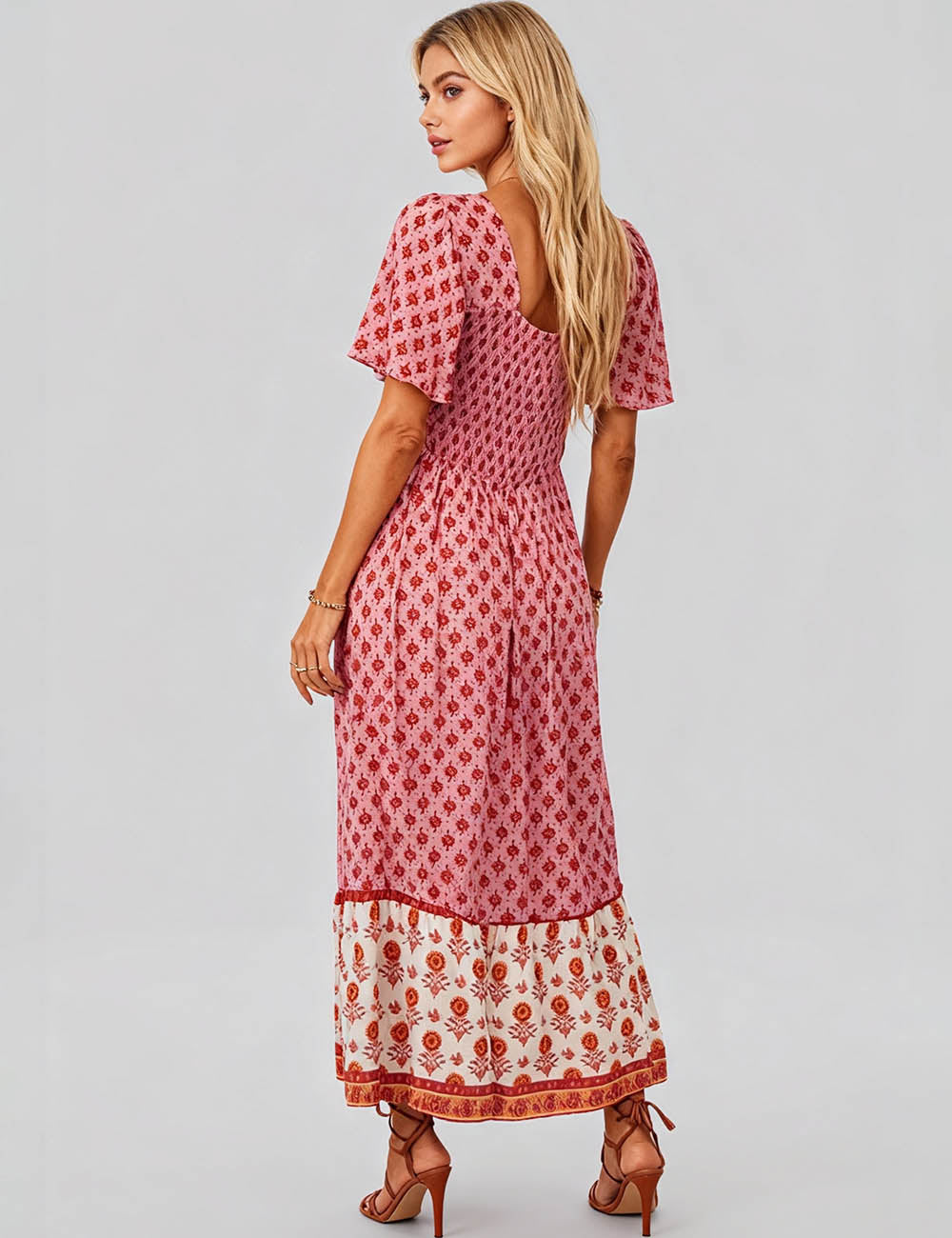 Ladies Boho Floral Print Square Neck Short Sleeves Maxi Dress