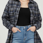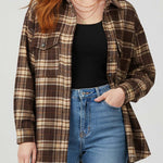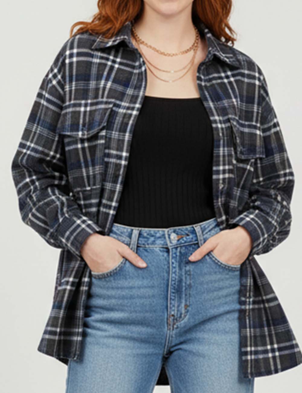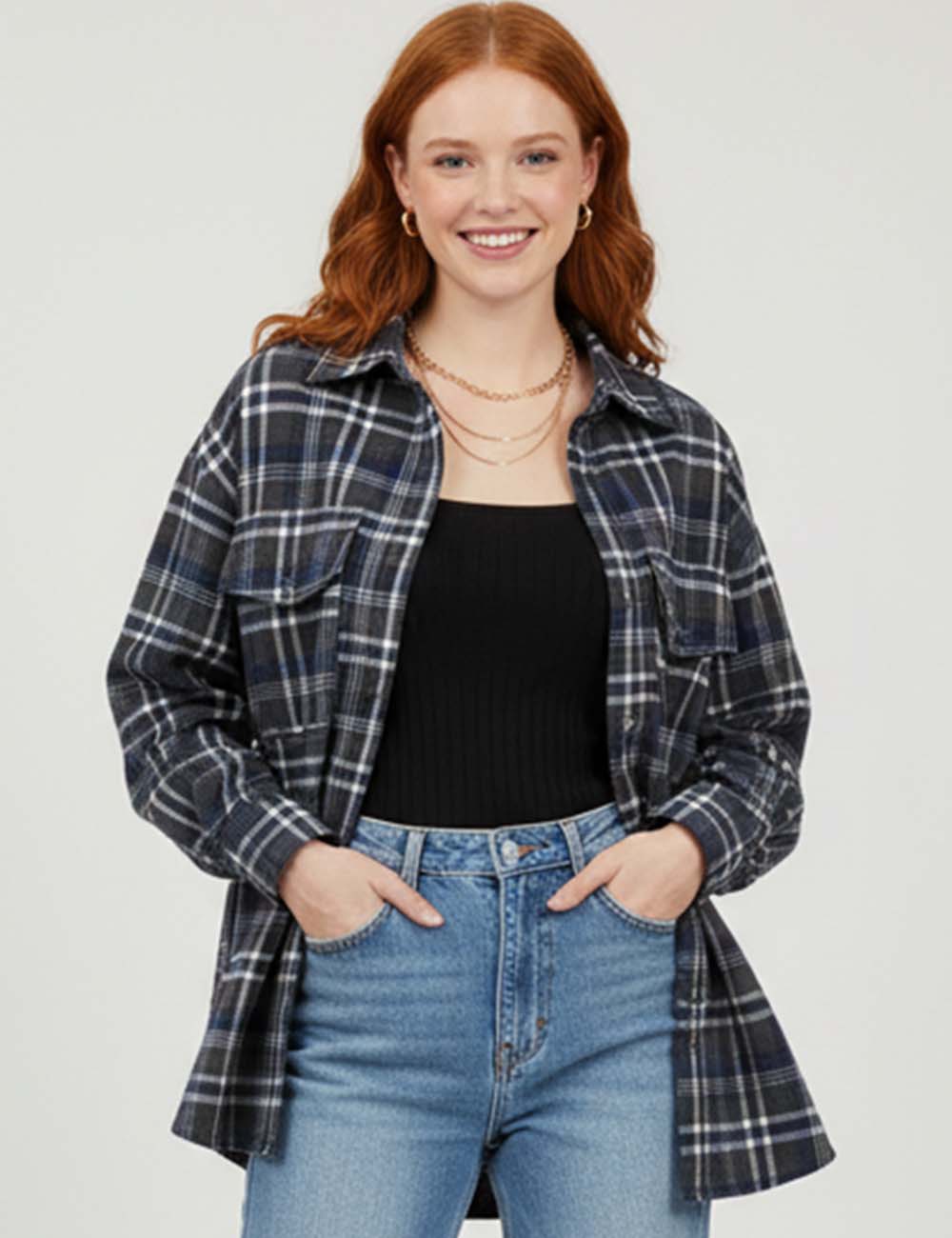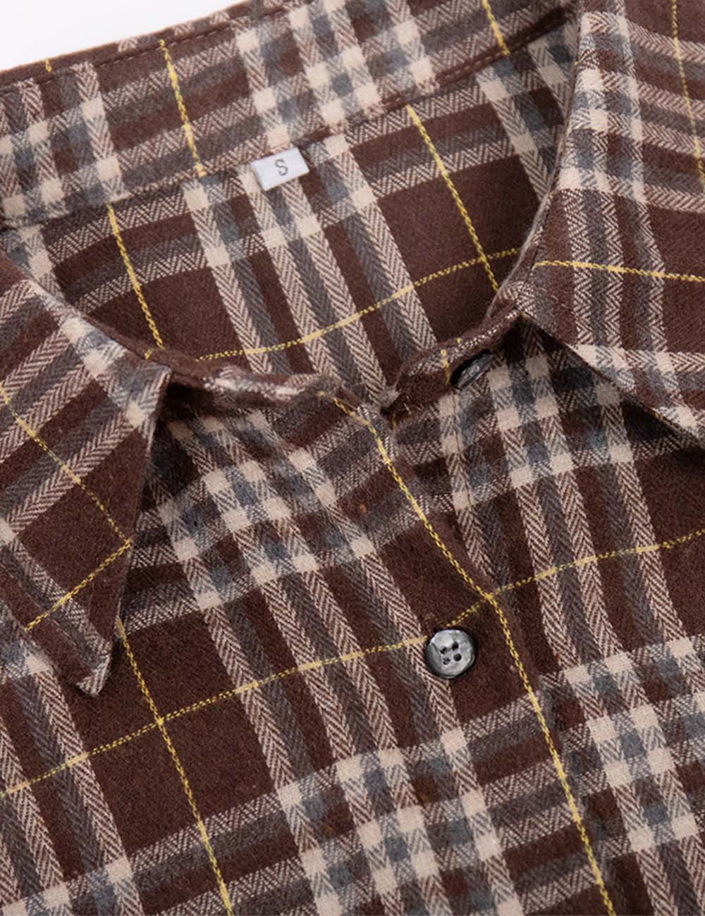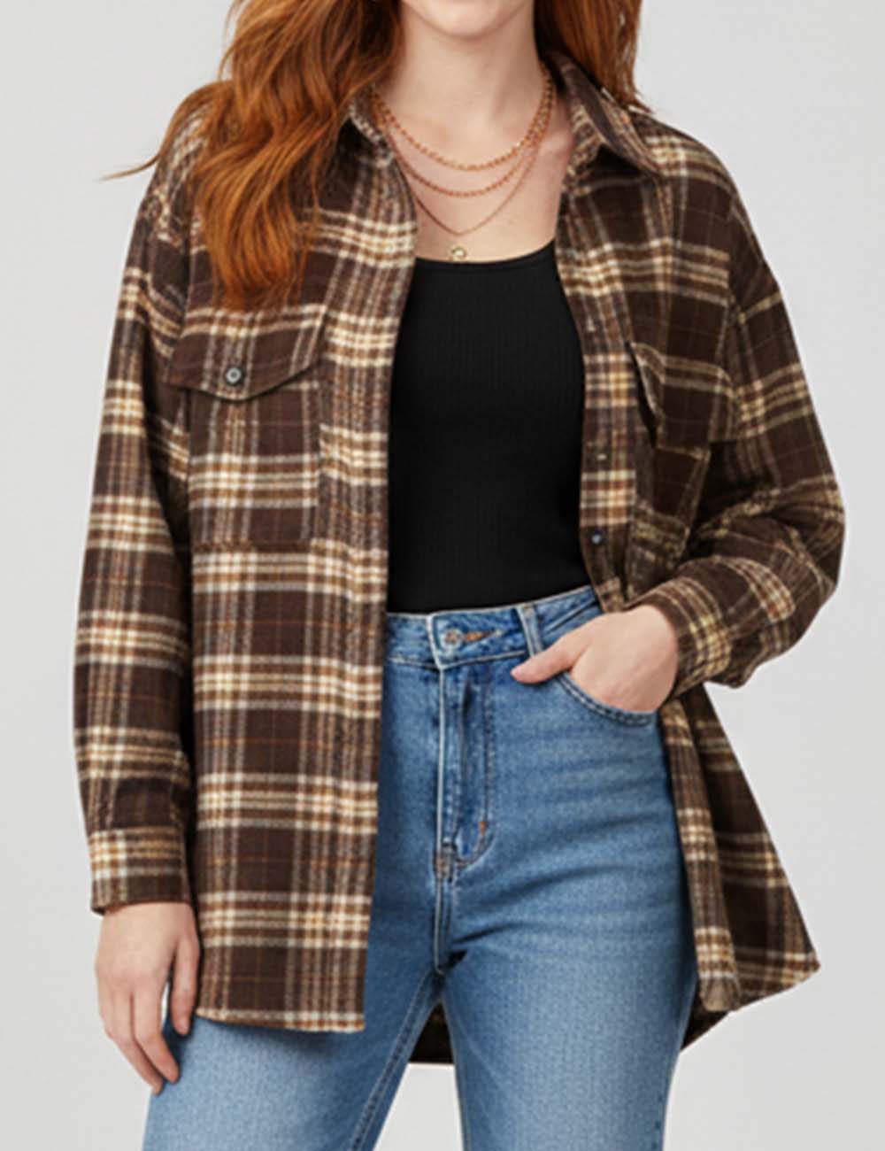 Ladies Button Down Long Sleeves Plaid Shirt Jacket