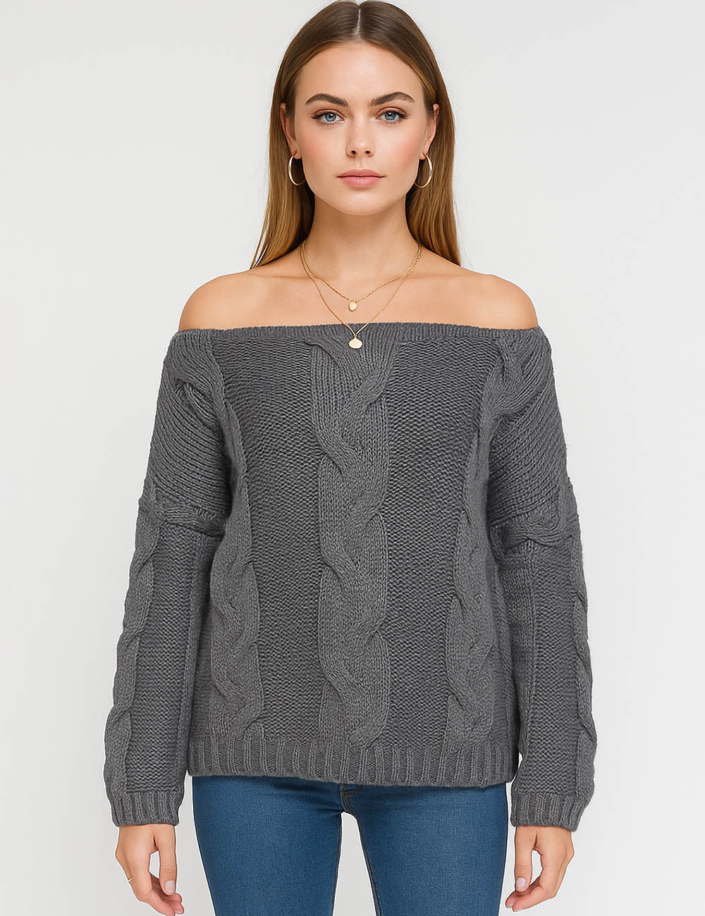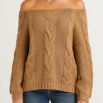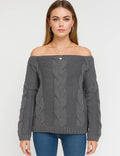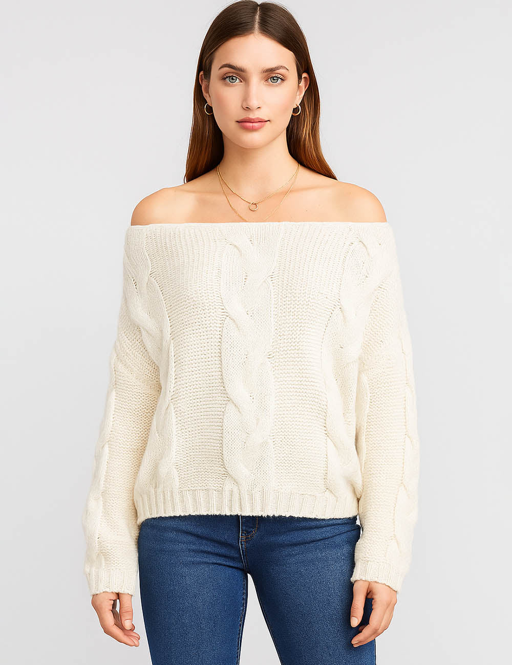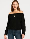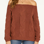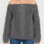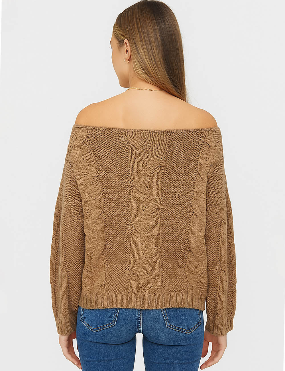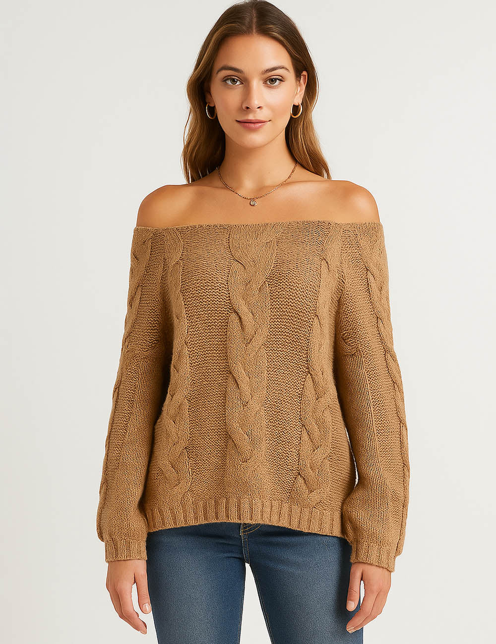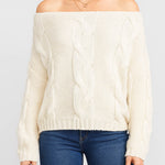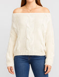 Ladies Cable Knit Off-Shoulder Lantern Sleeves Pullover Sweater