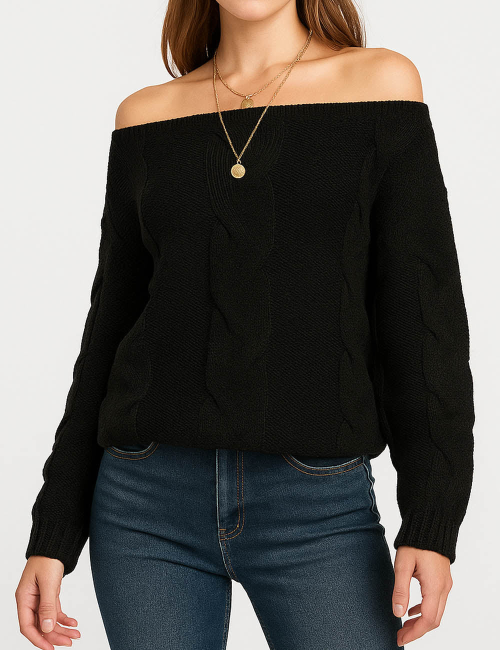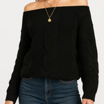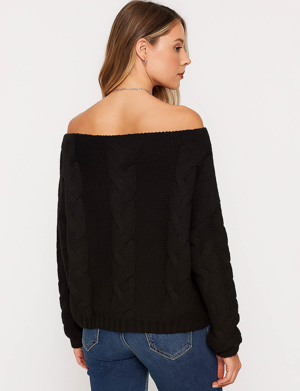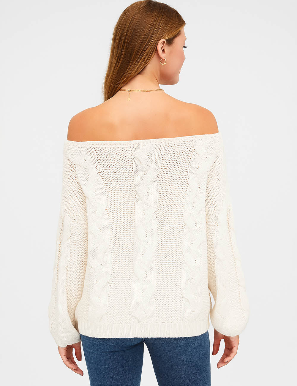 Ladies Cable Knit Off-Shoulder Lantern Sleeves Pullover Sweater