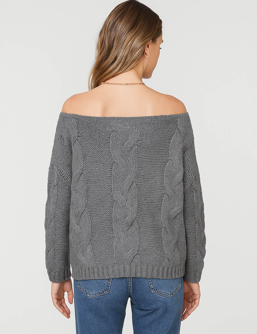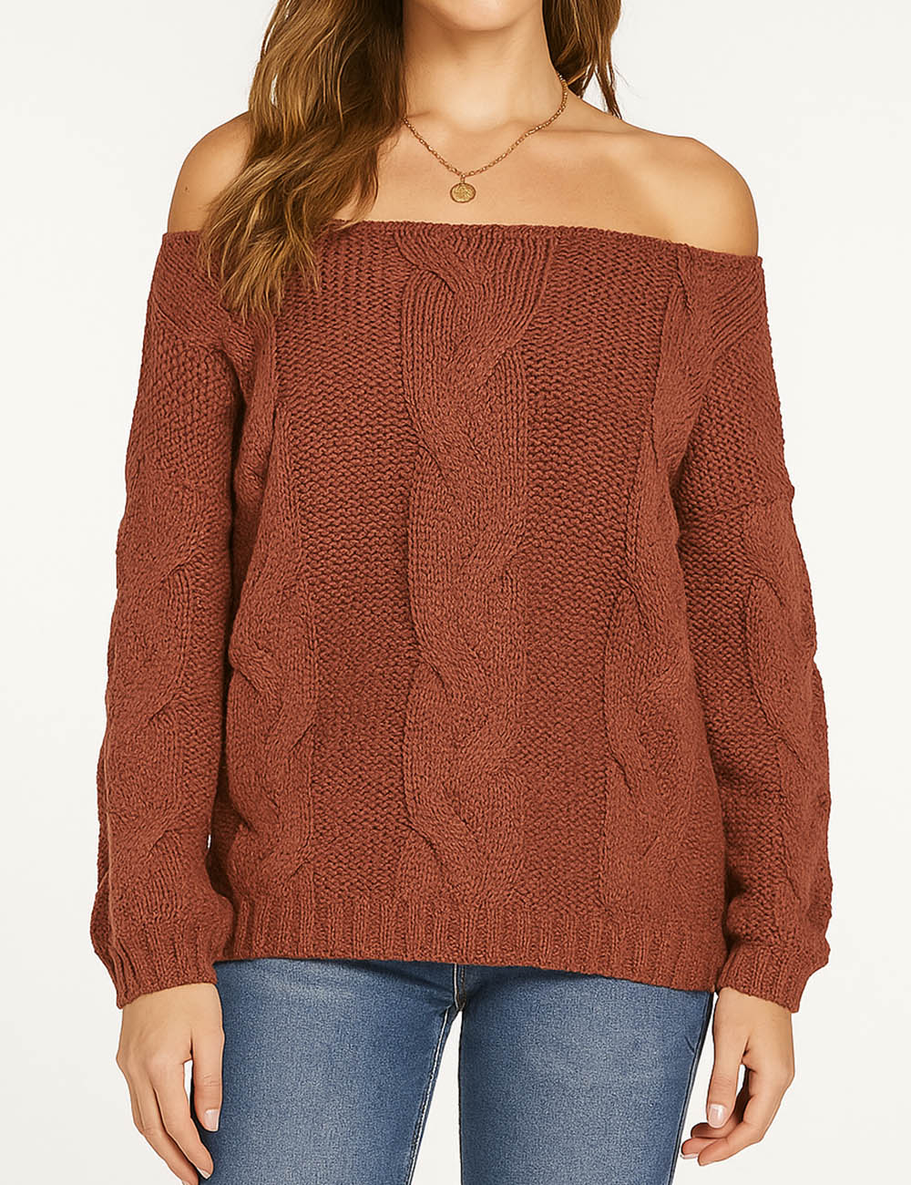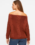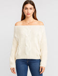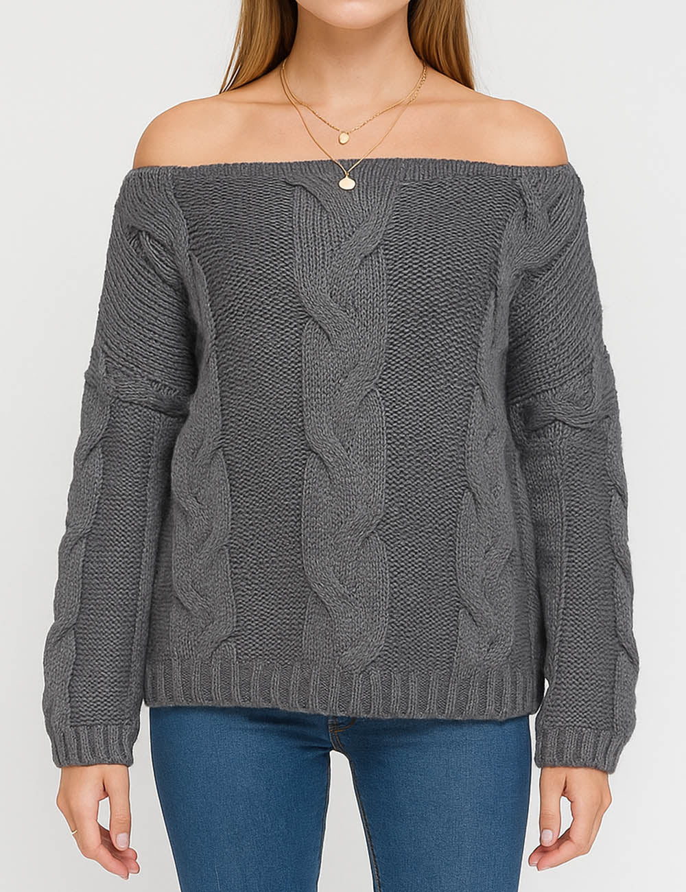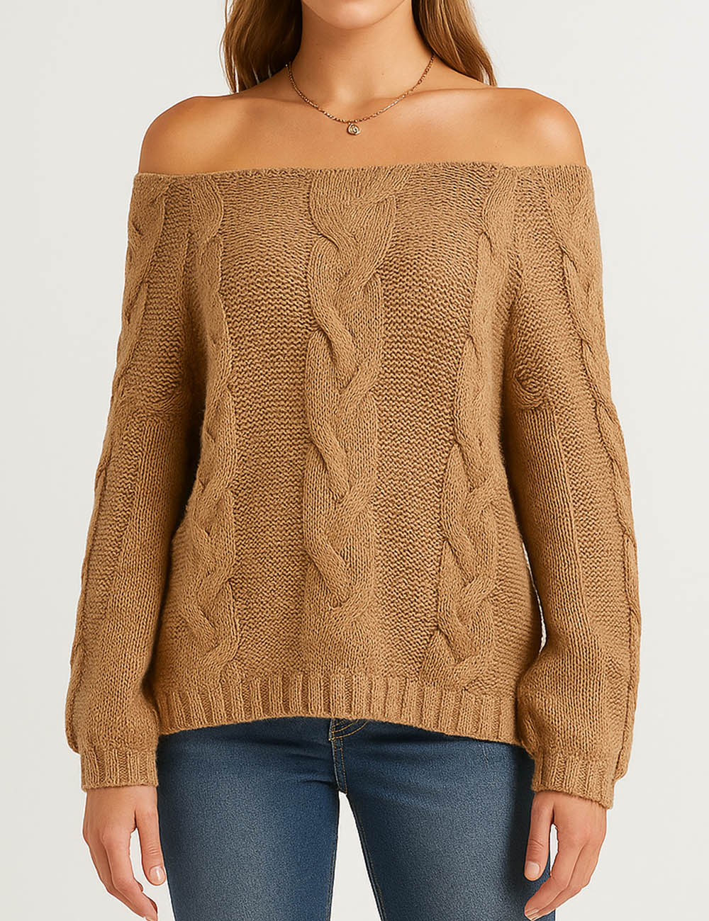 Ladies Cable Knit Off-Shoulder Lantern Sleeves Pullover Sweater