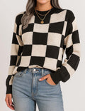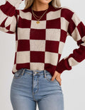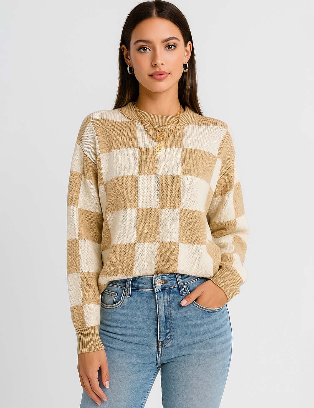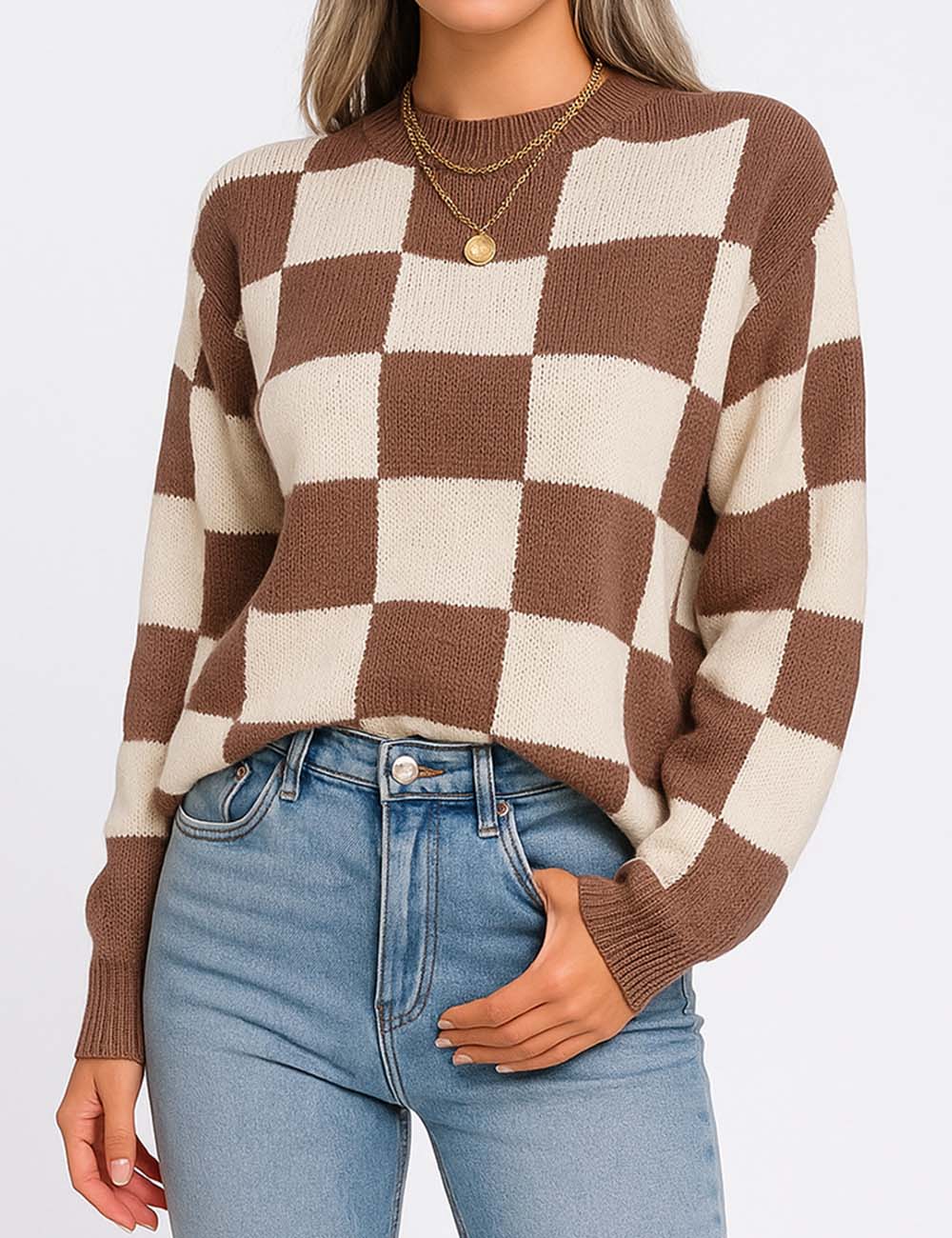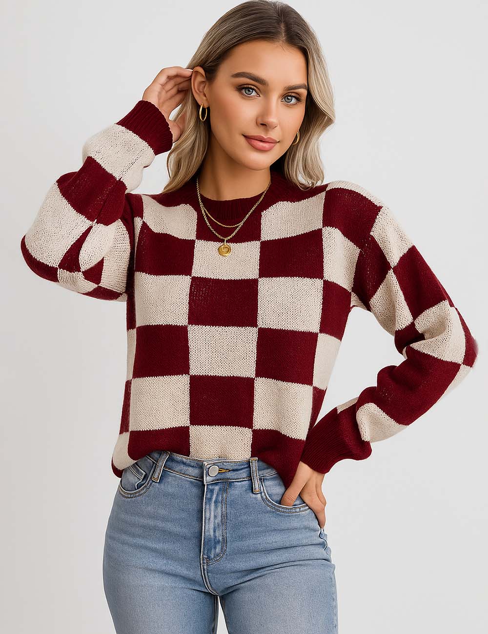 Ladies Checked Round Neck Long Sleeves Knit Sweater