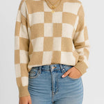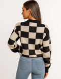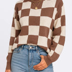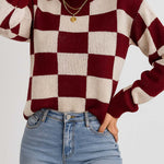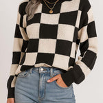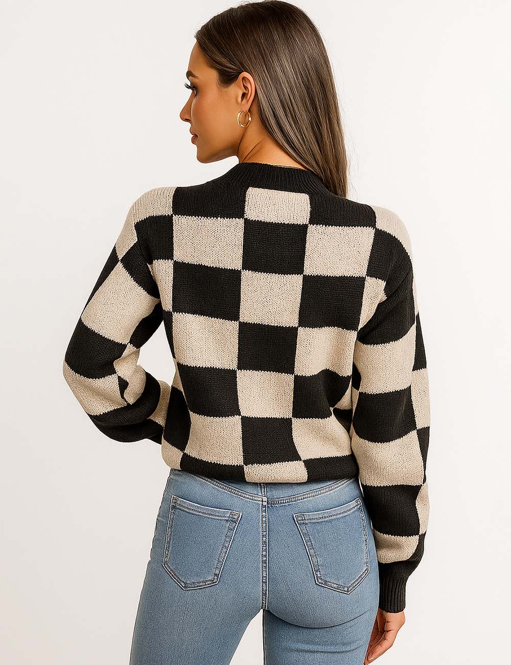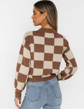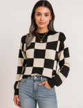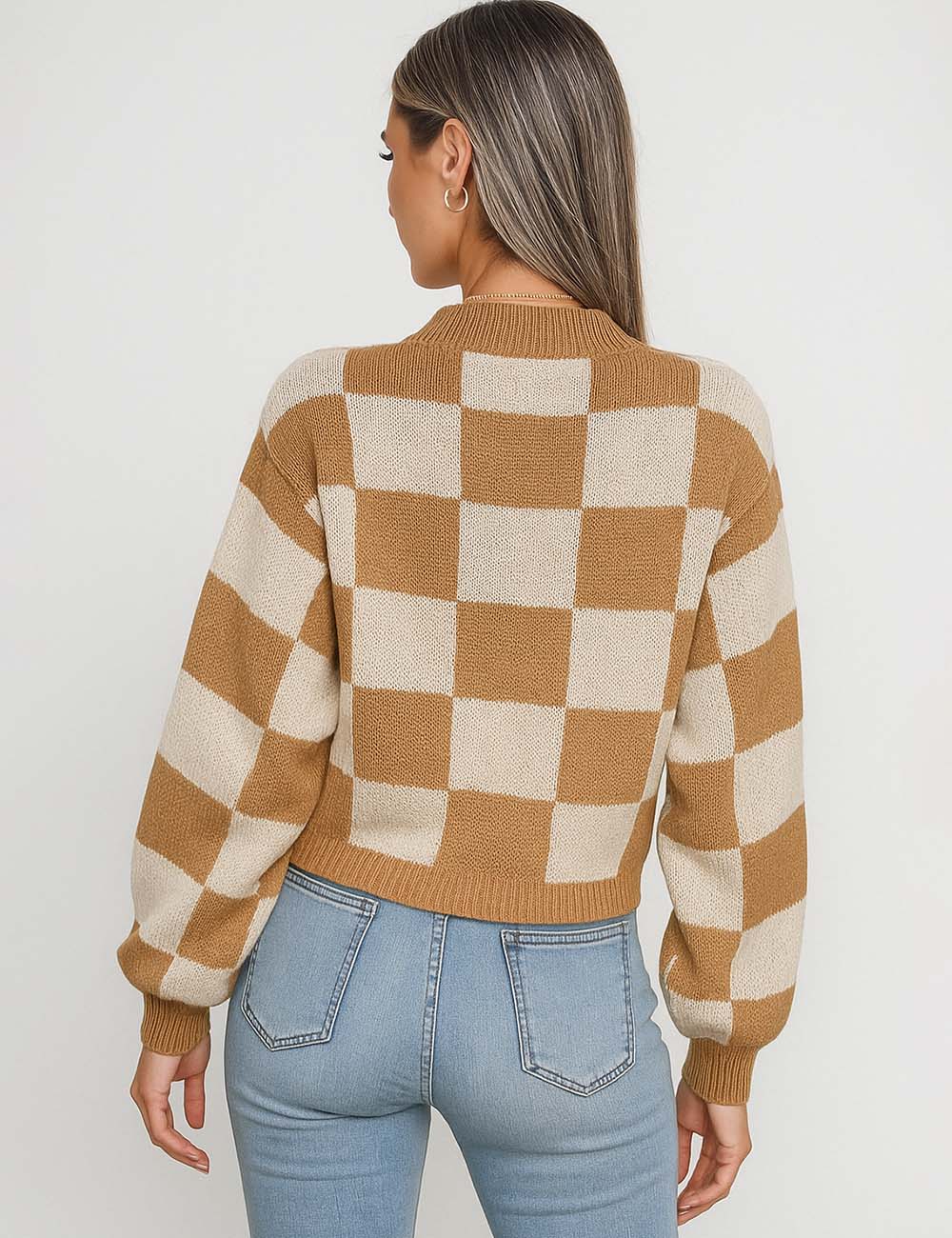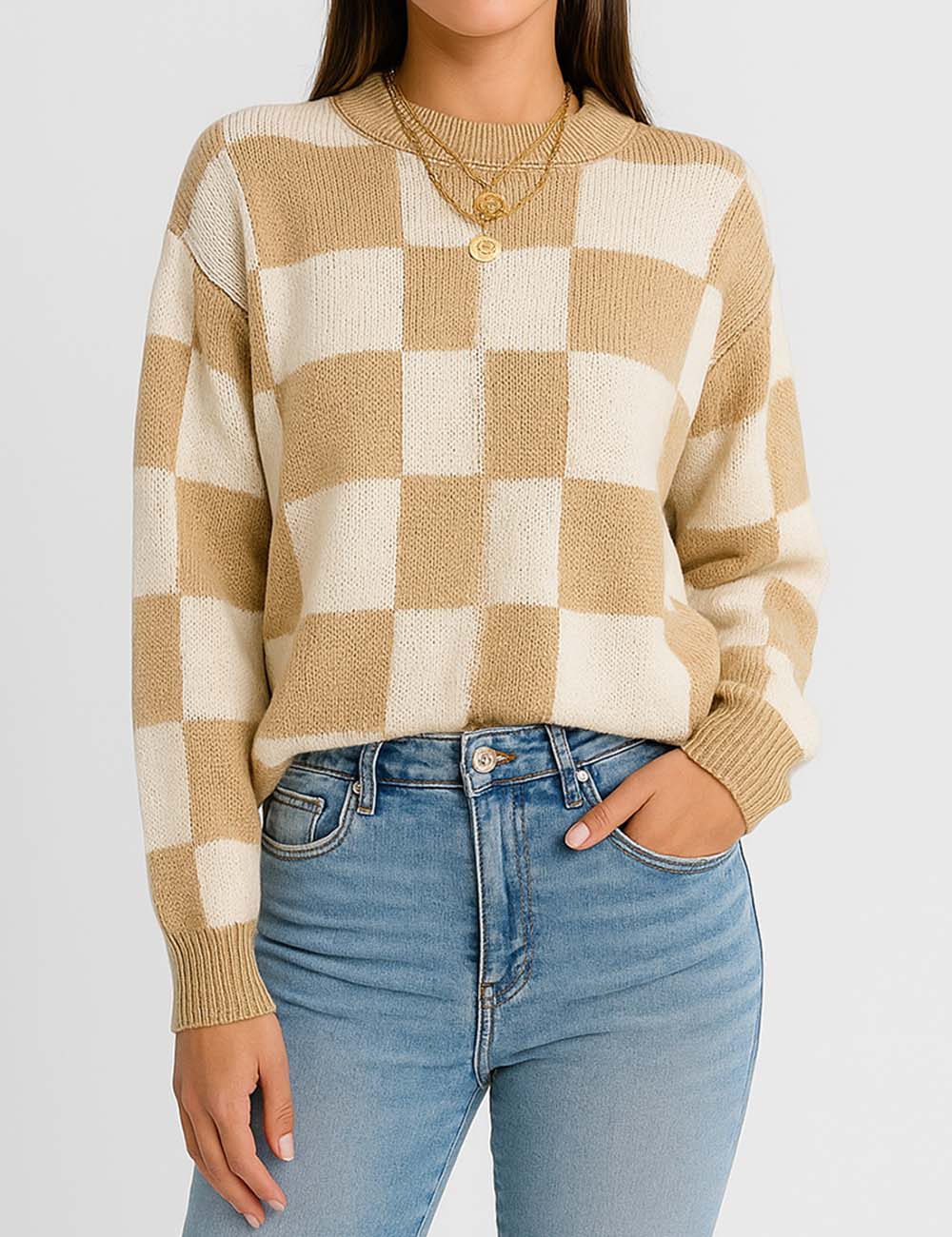 Ladies Checked Round Neck Long Sleeves Knit Sweater