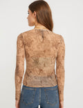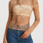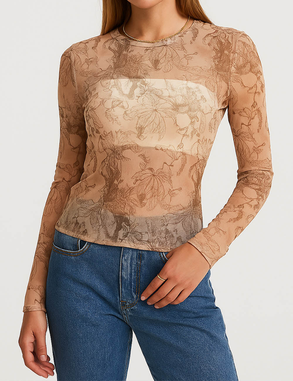 Ladies Chic Floral Print Layering See Sheer Long Sleeves Mesh Top