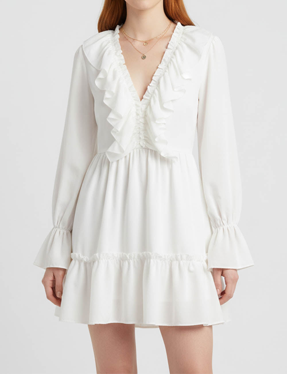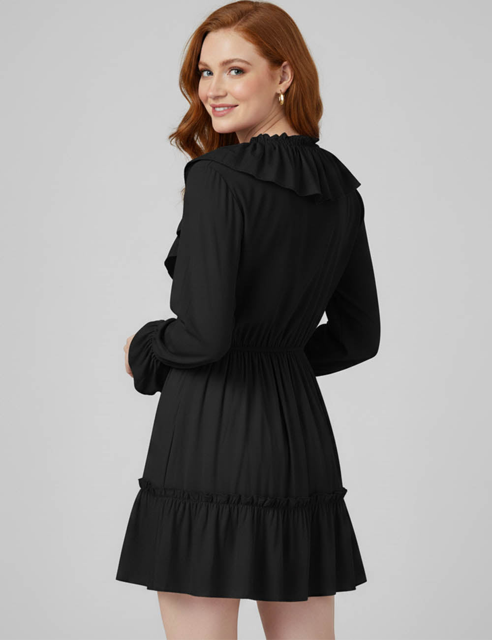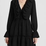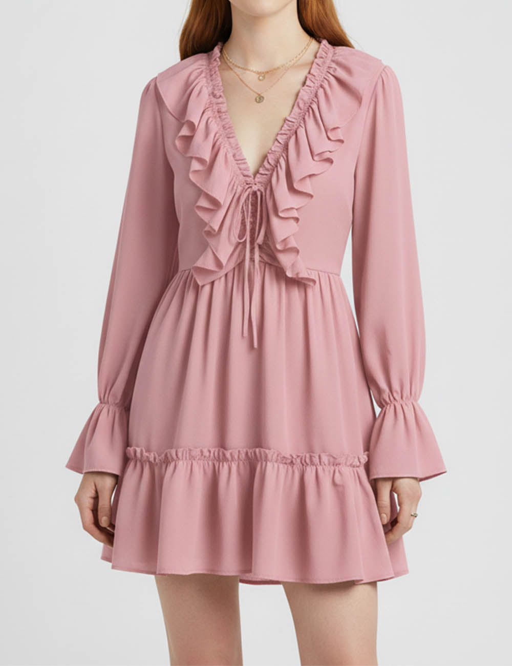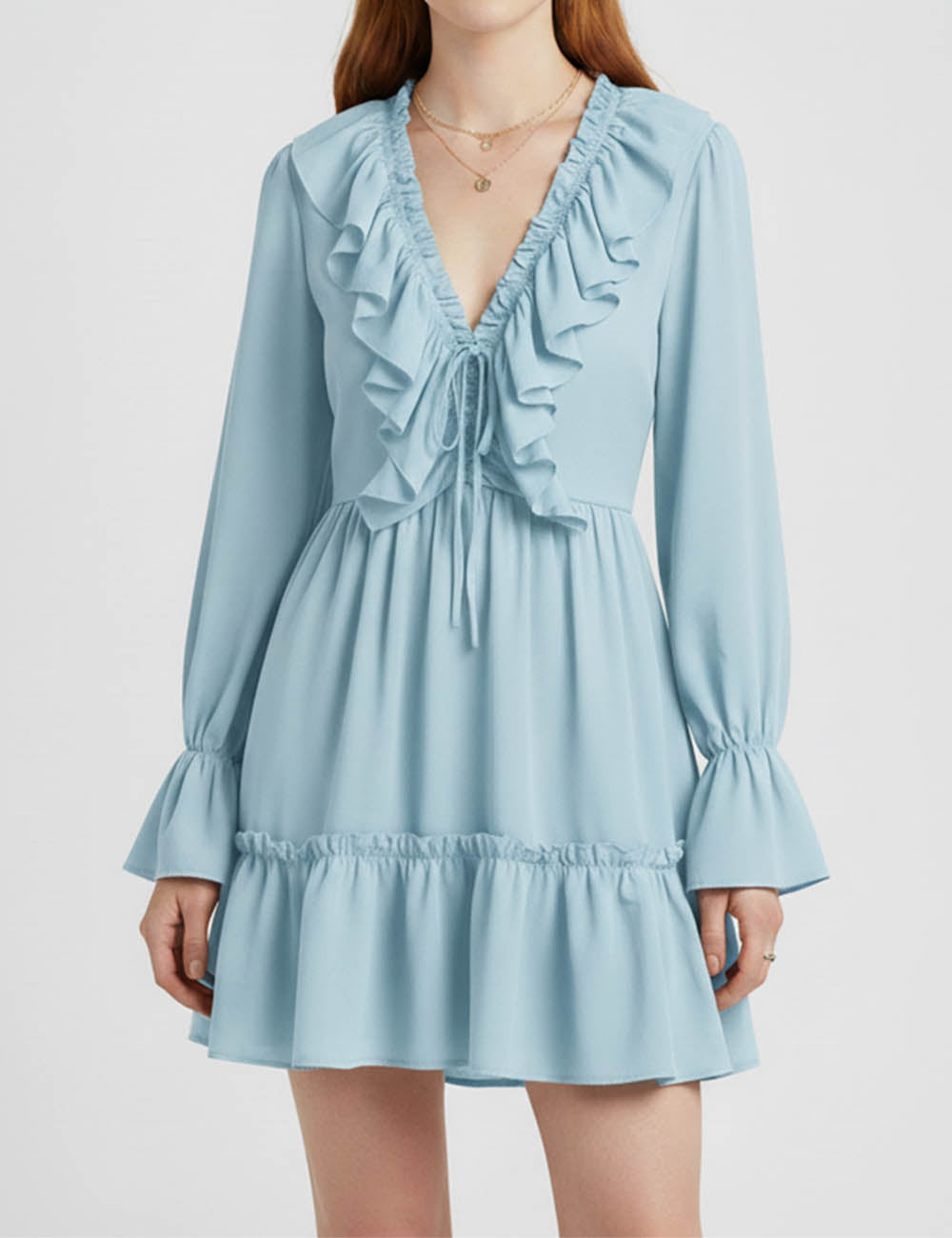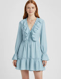Ladies Chiffon Ruched V-Neck Ruffle Trim Mini Dress