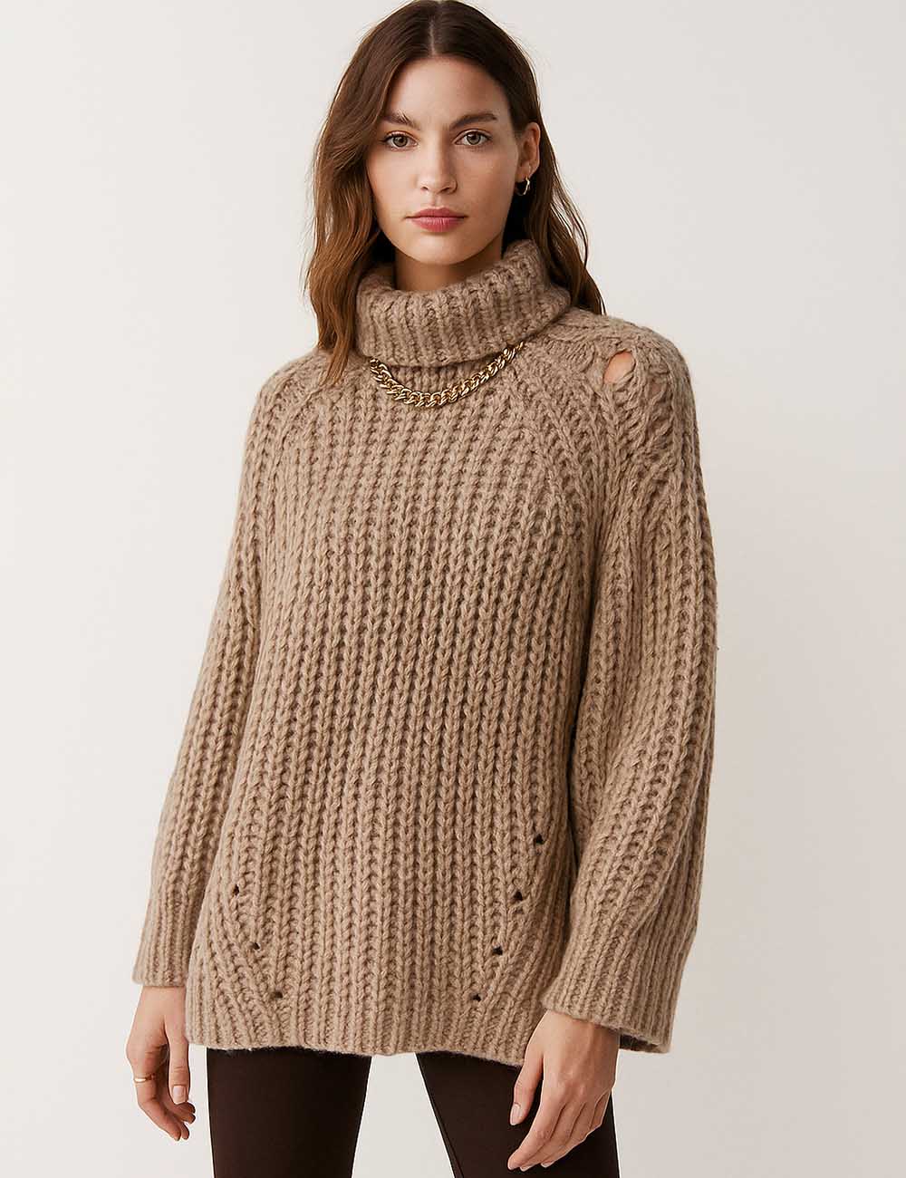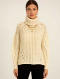 Ladies Chunky Knit Turtle Neck Eyelet Long Sleeves Sweater