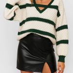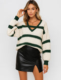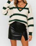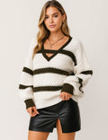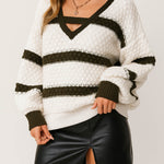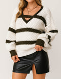 Ladies Chunky Striped Knit V-Neck Lantern Sleeves Sweater