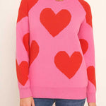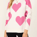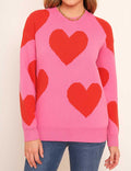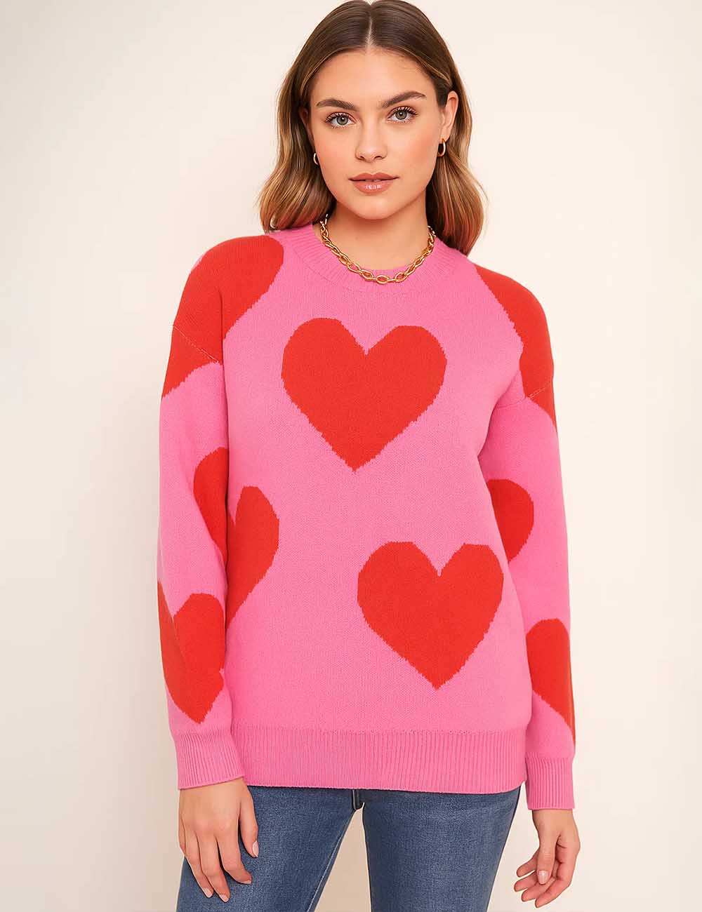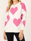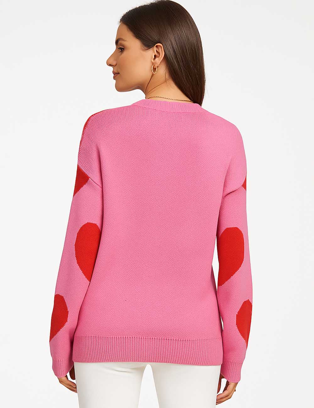 Ladies Color Block Heart Print Round Collar Knit Sweater