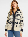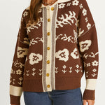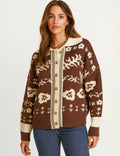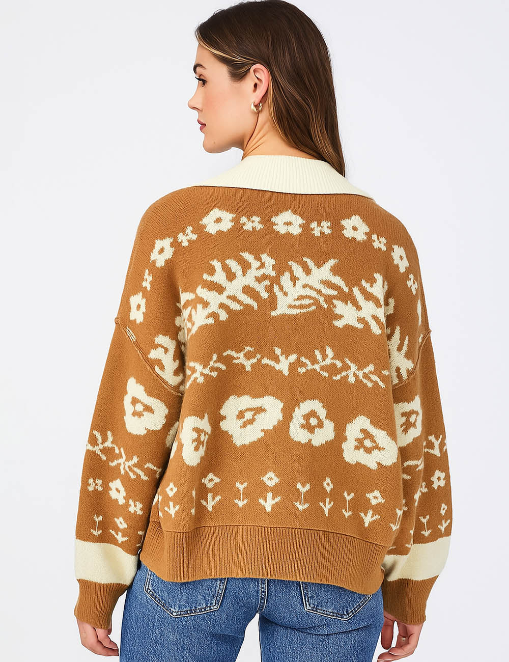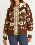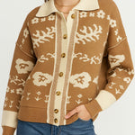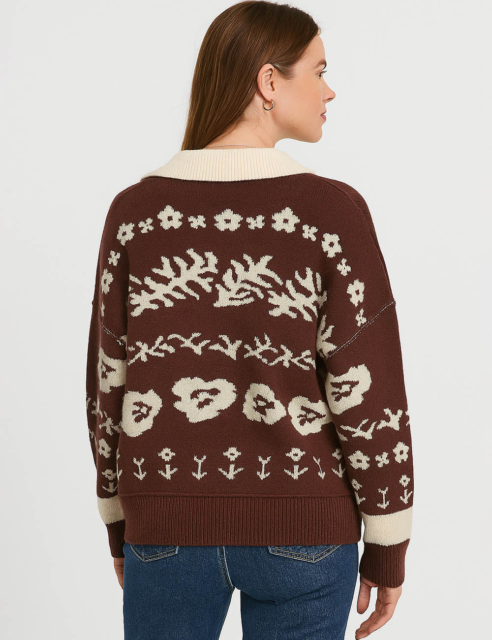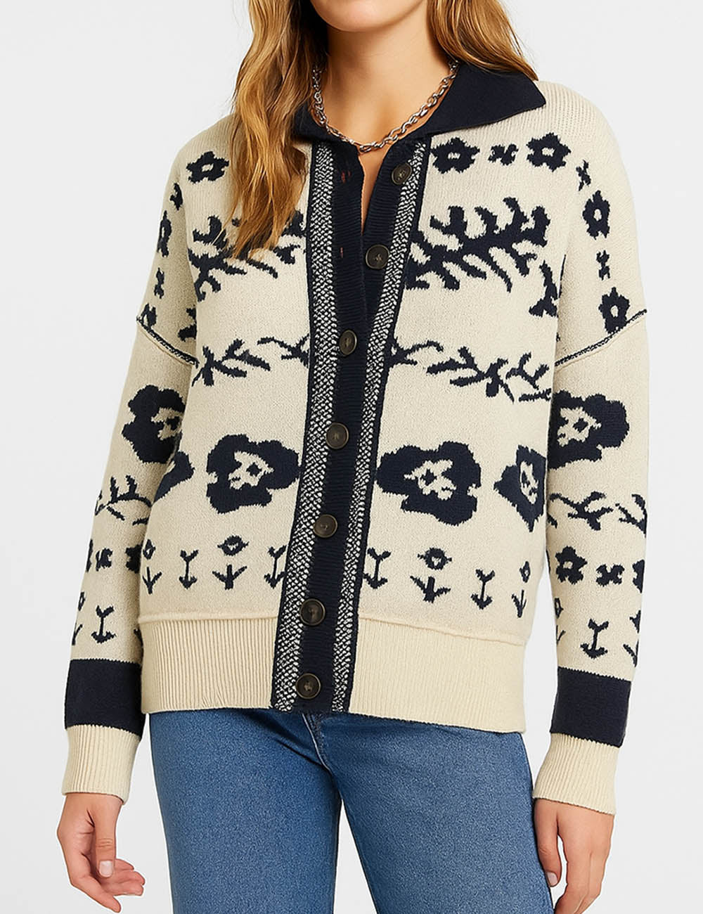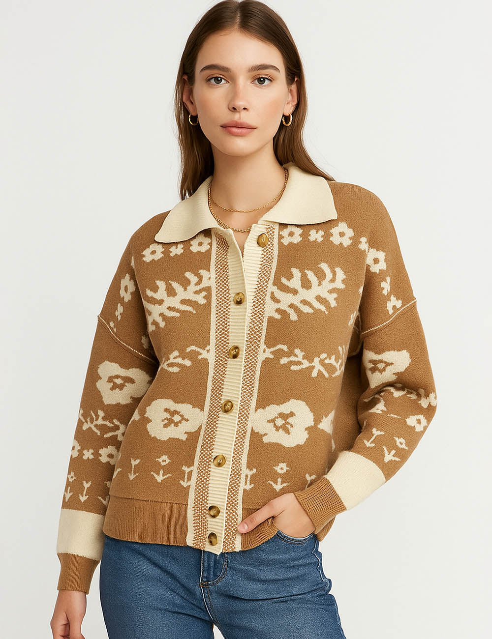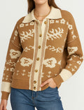 Ladies Color Block Lapel Collar Floral Pattern Sweater Cardigan