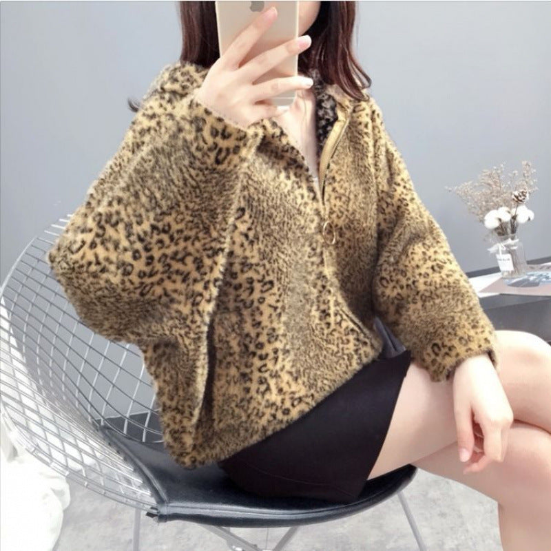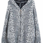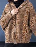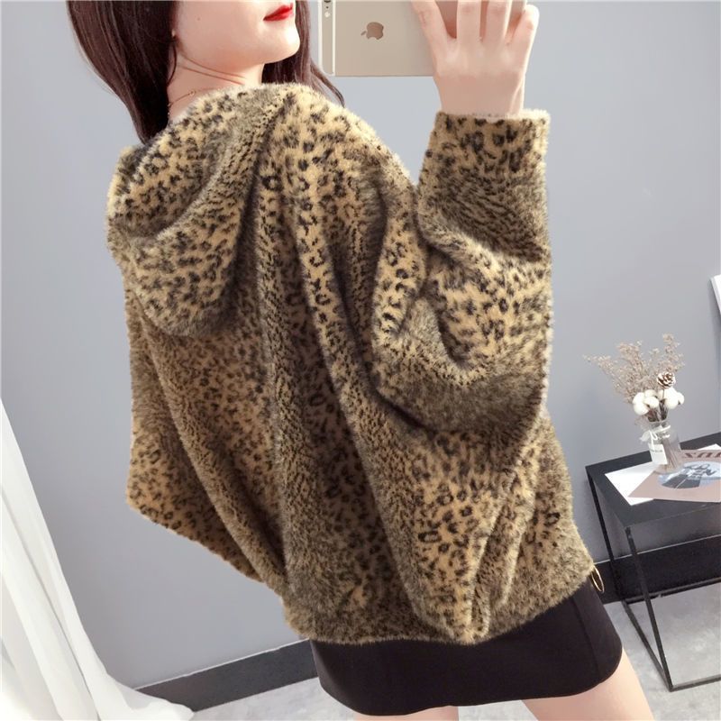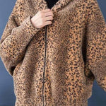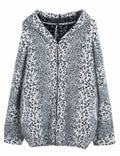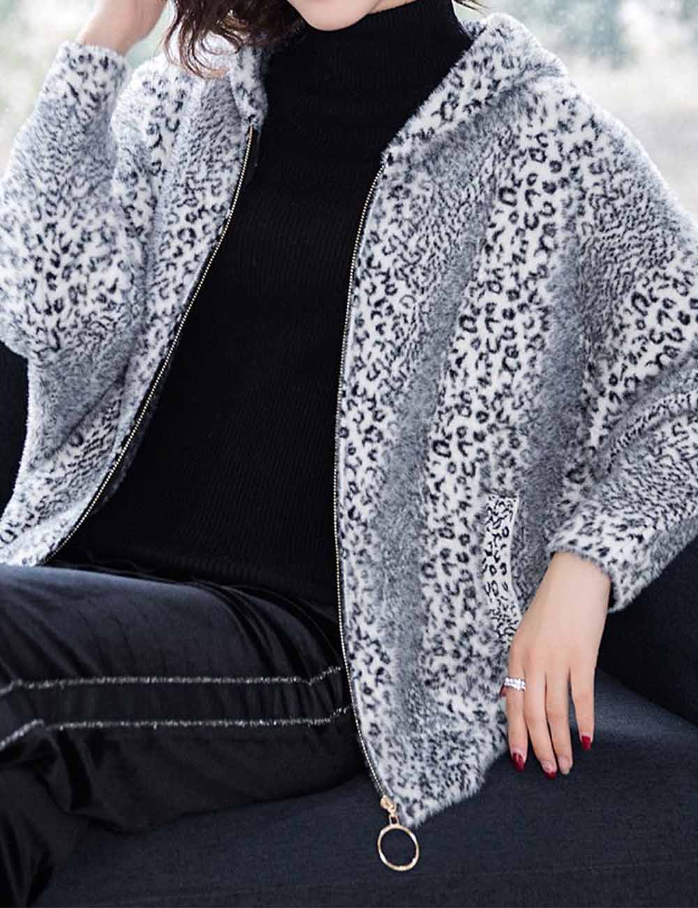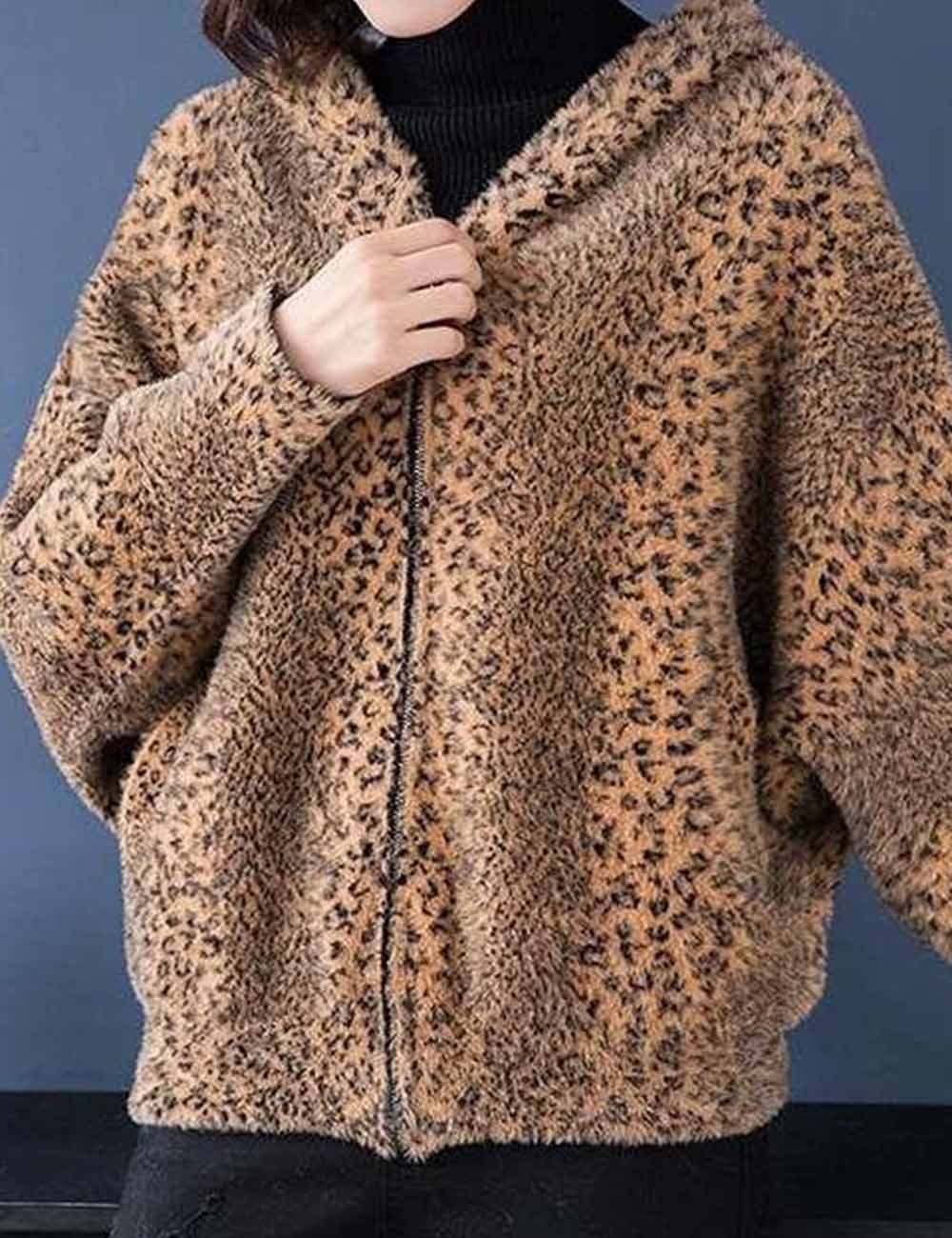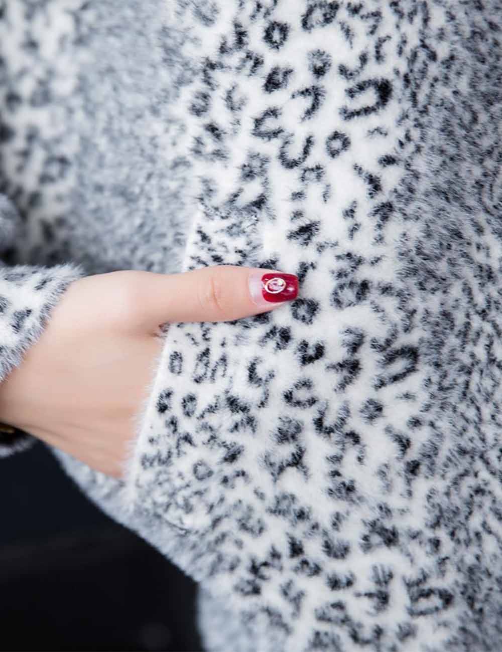 Ladies Color Block Leopard Print Long Sleeves Furry Knit Coat
