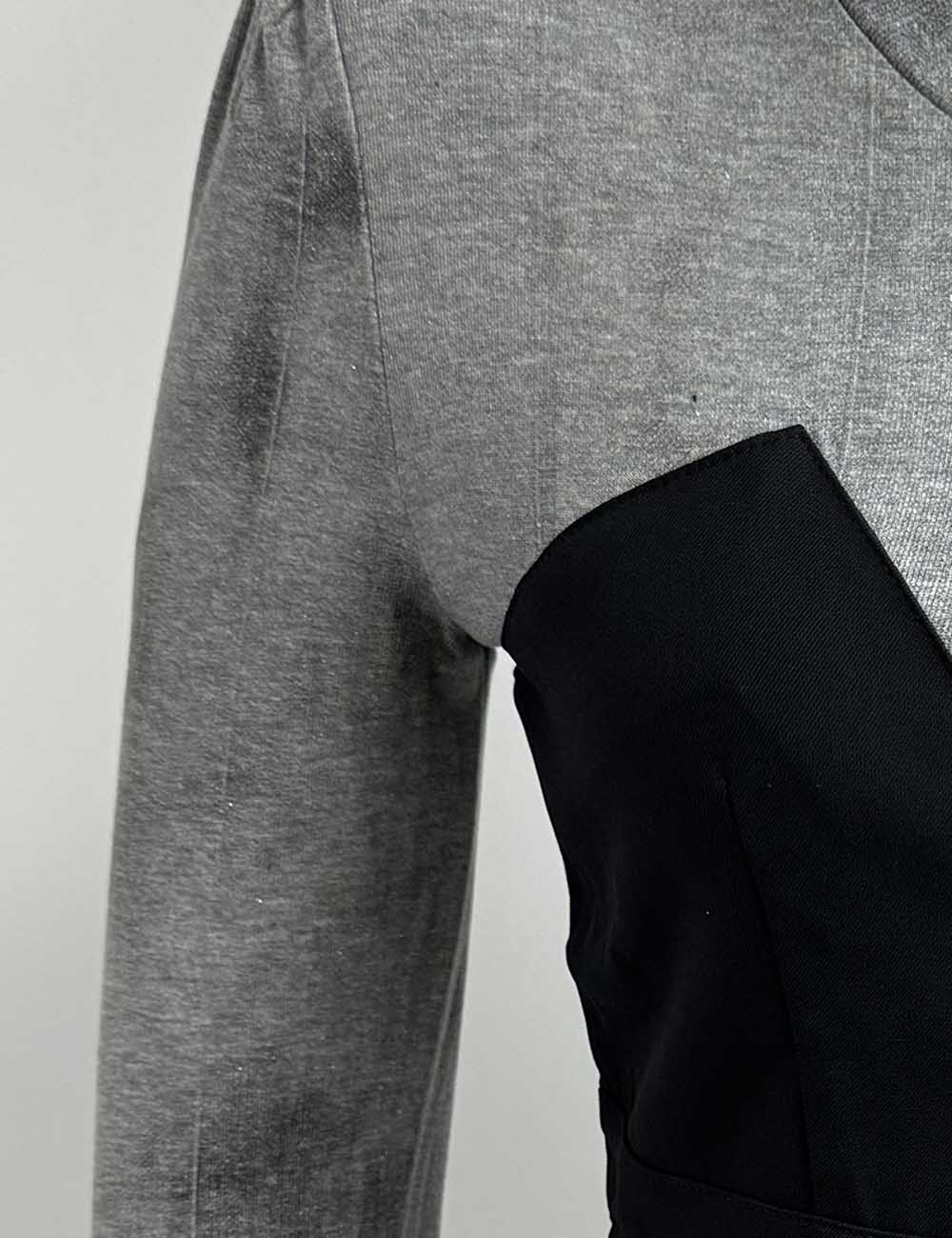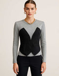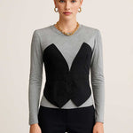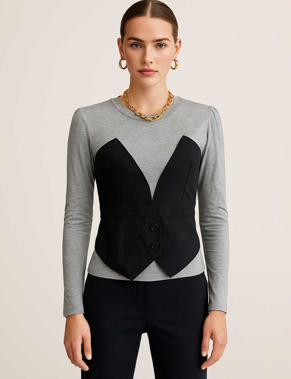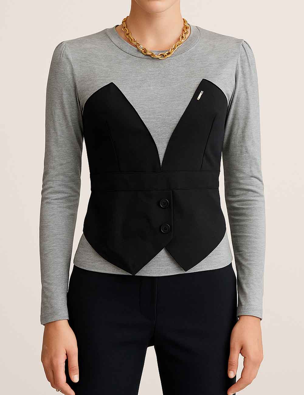 Ladies Color Block Patchwork Long Sleeves Fake 2PCS Top