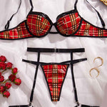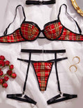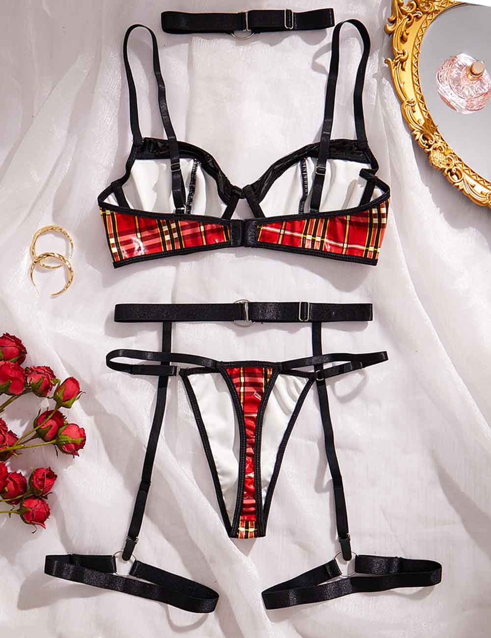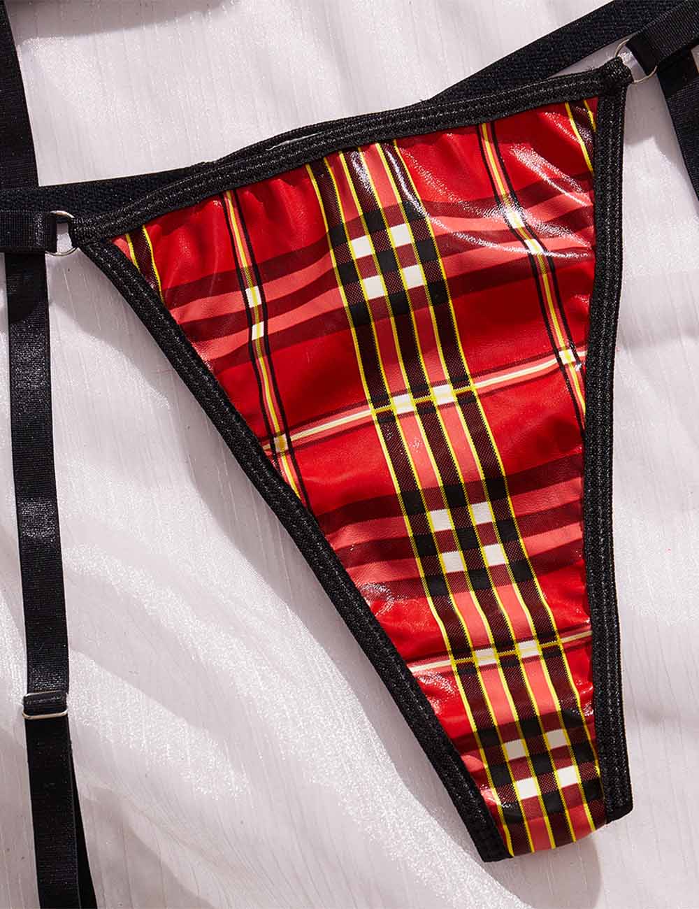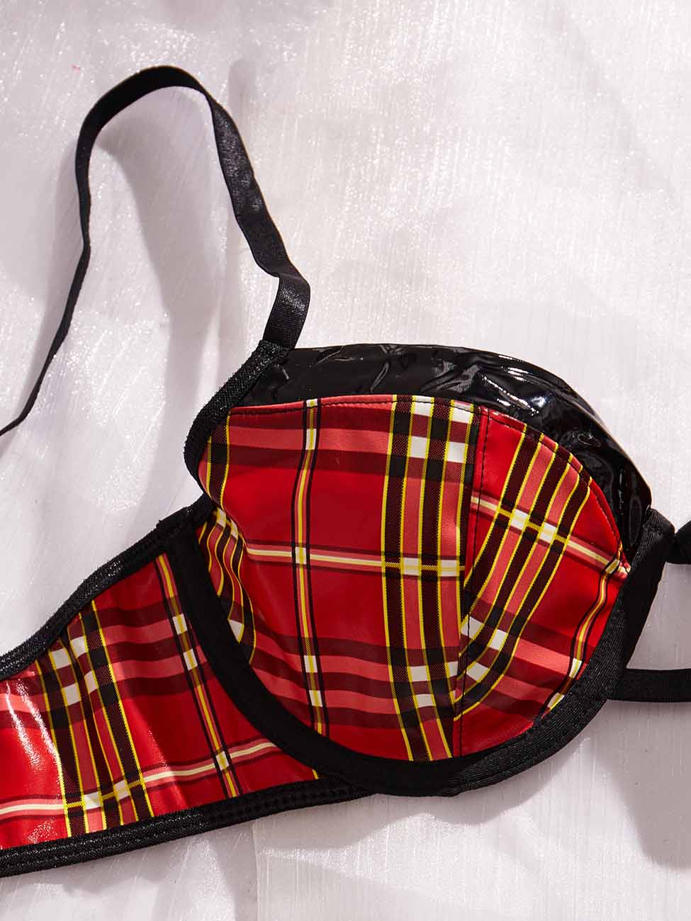 Ladies Color Block Plaid PU 2PCS Lingerie Set