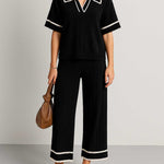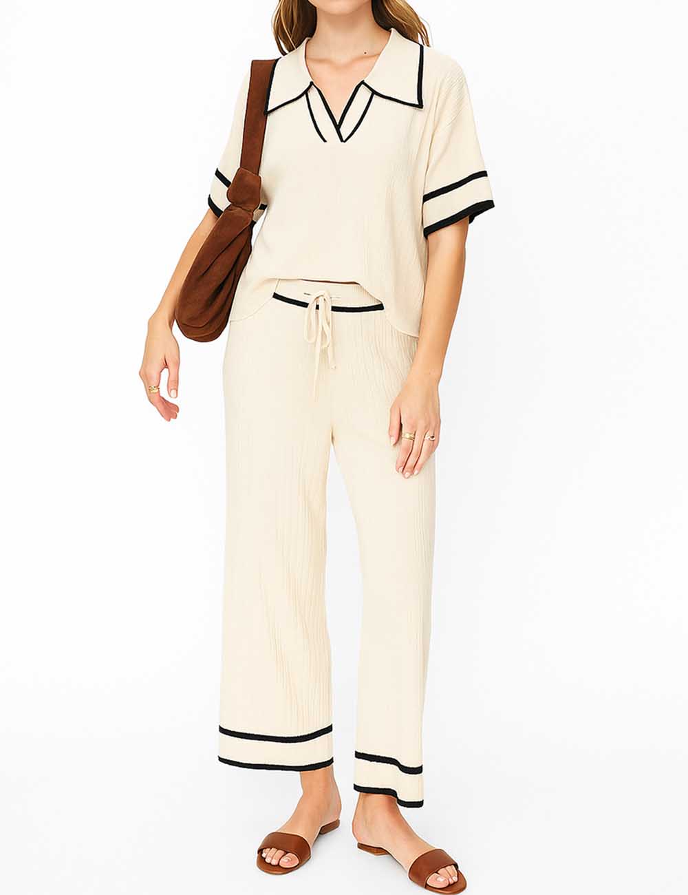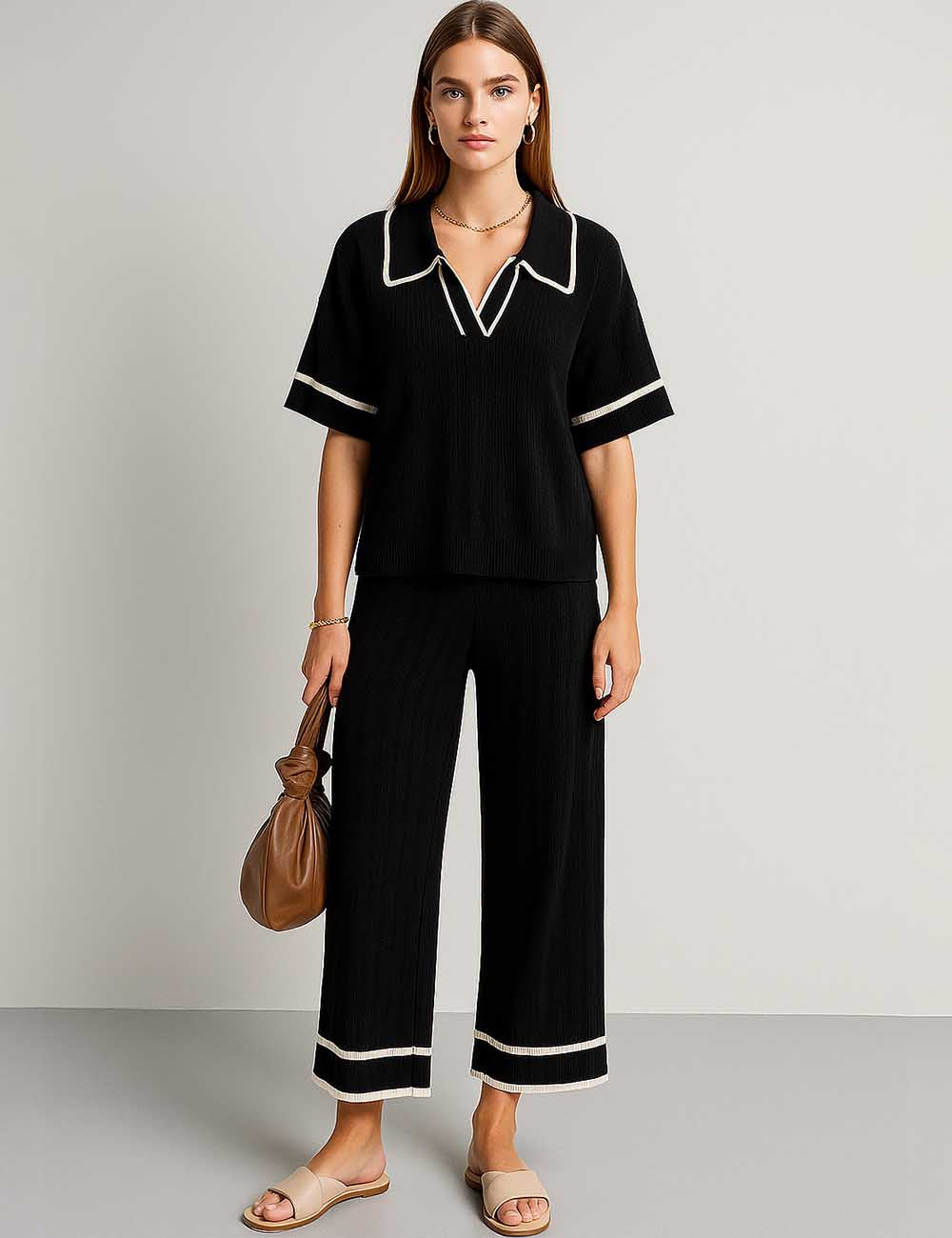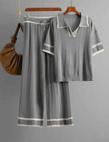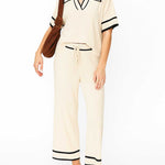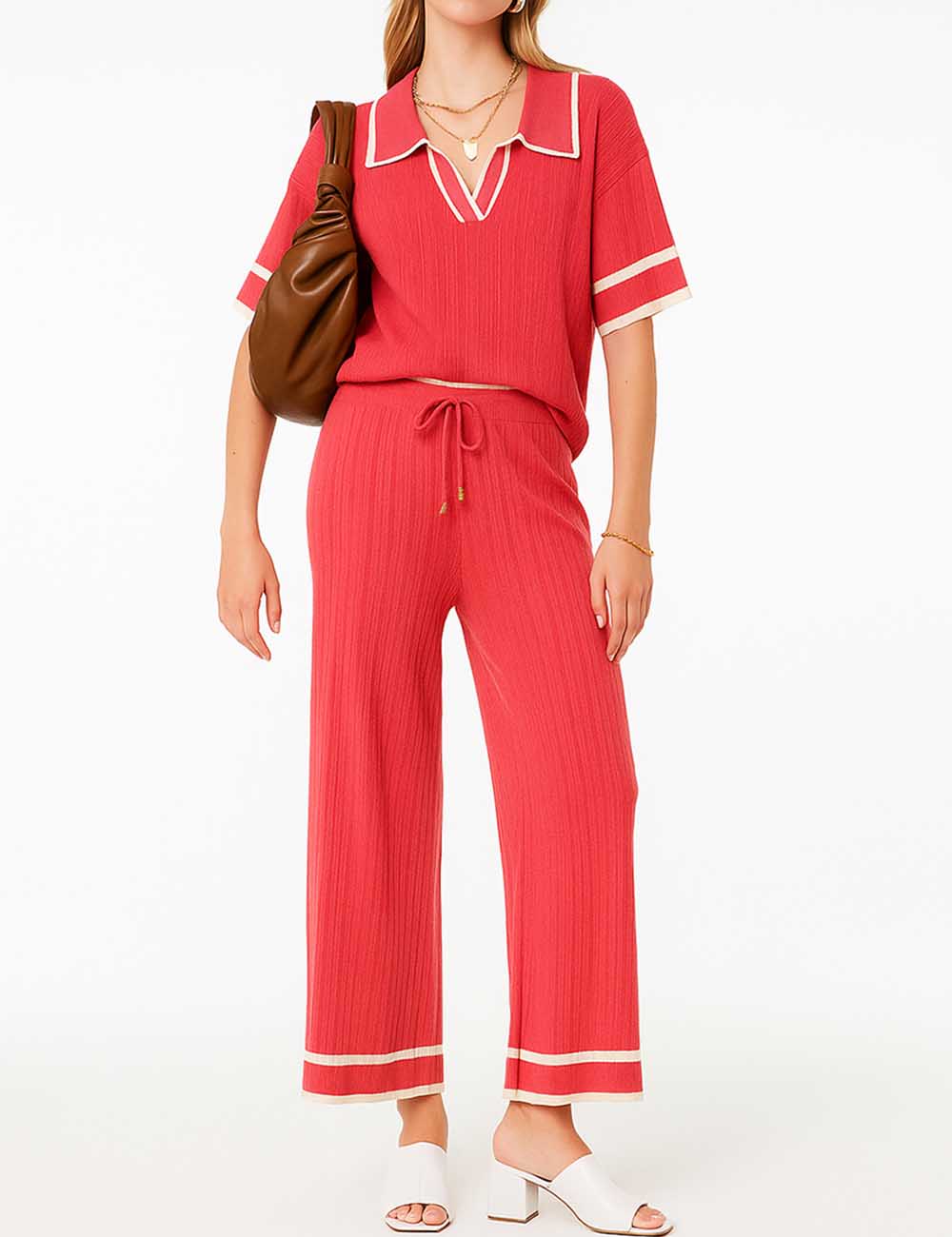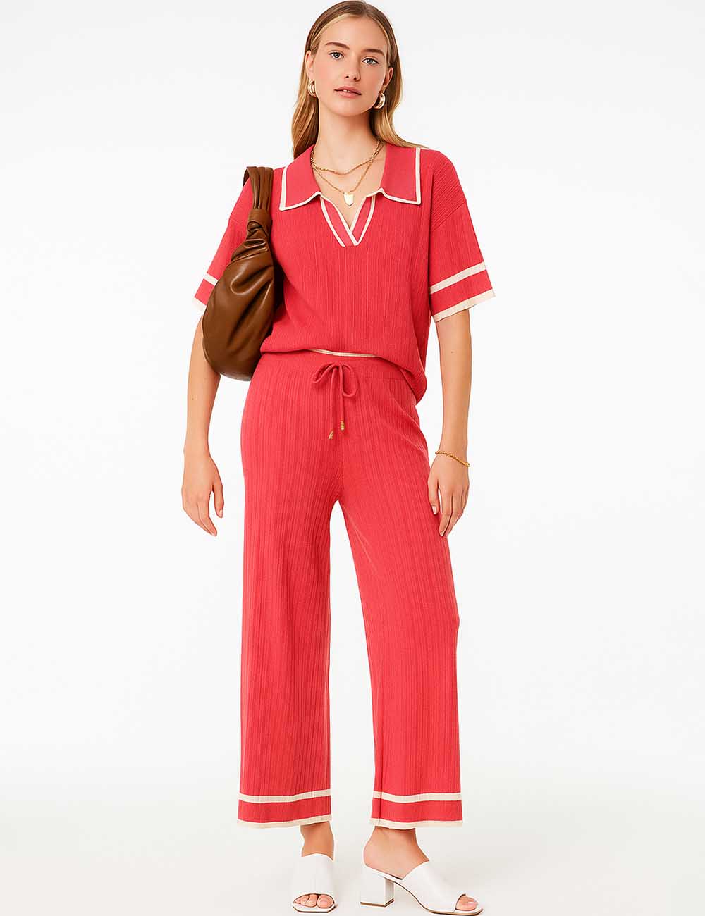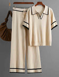 Ladies Color Block Polo Collar Knit Top & Pants 2PCS Set