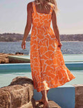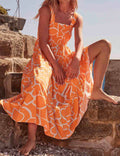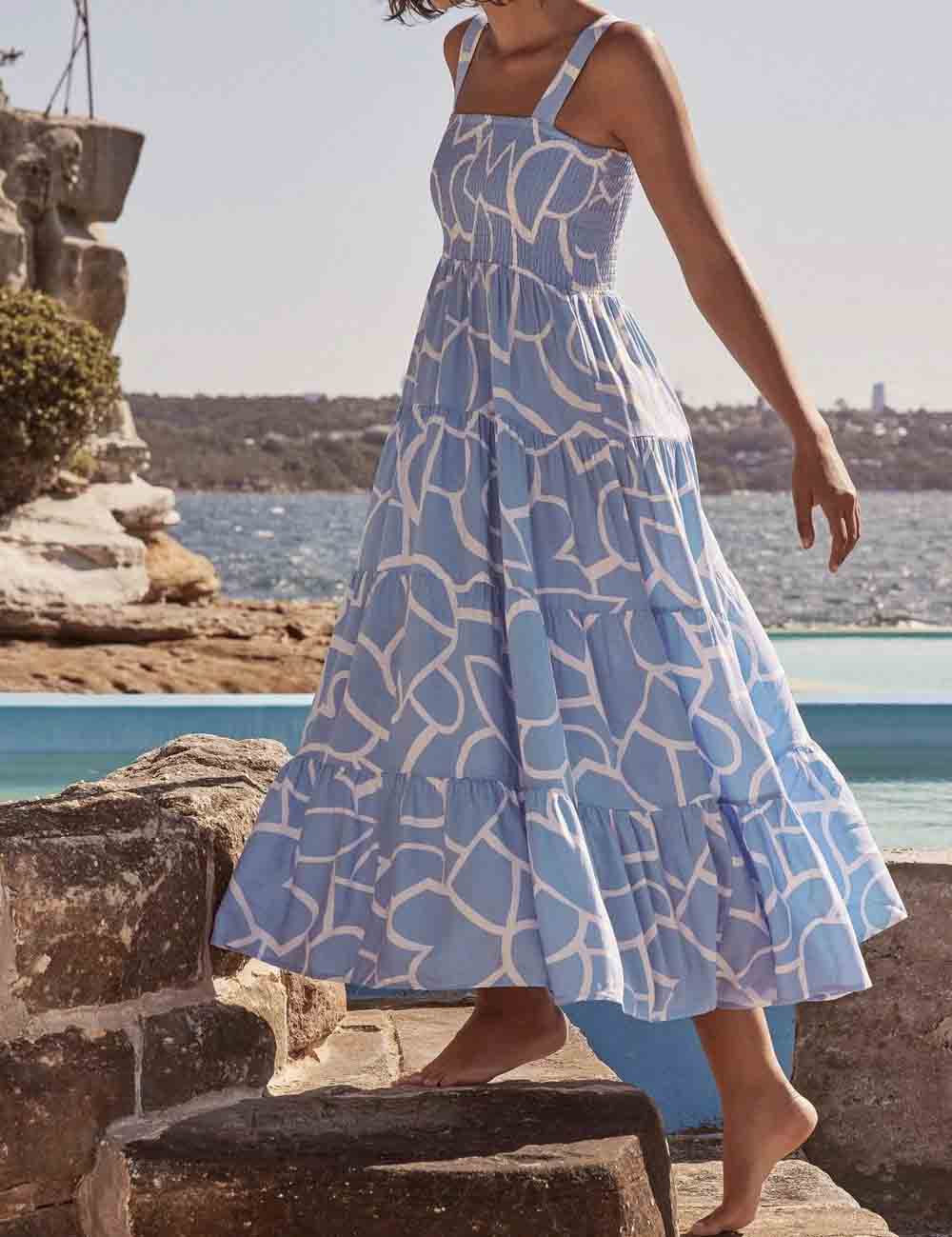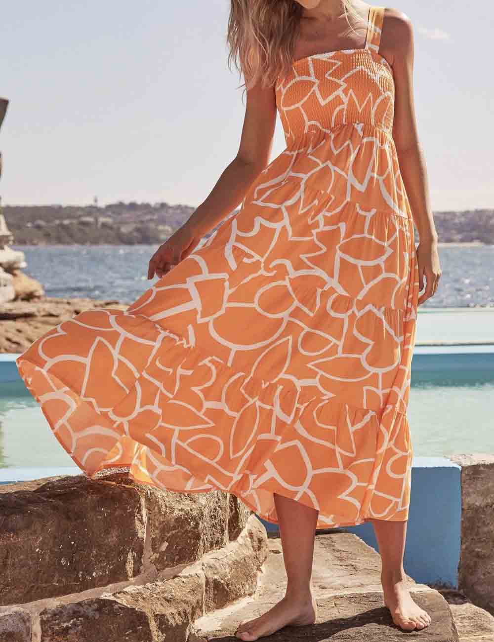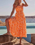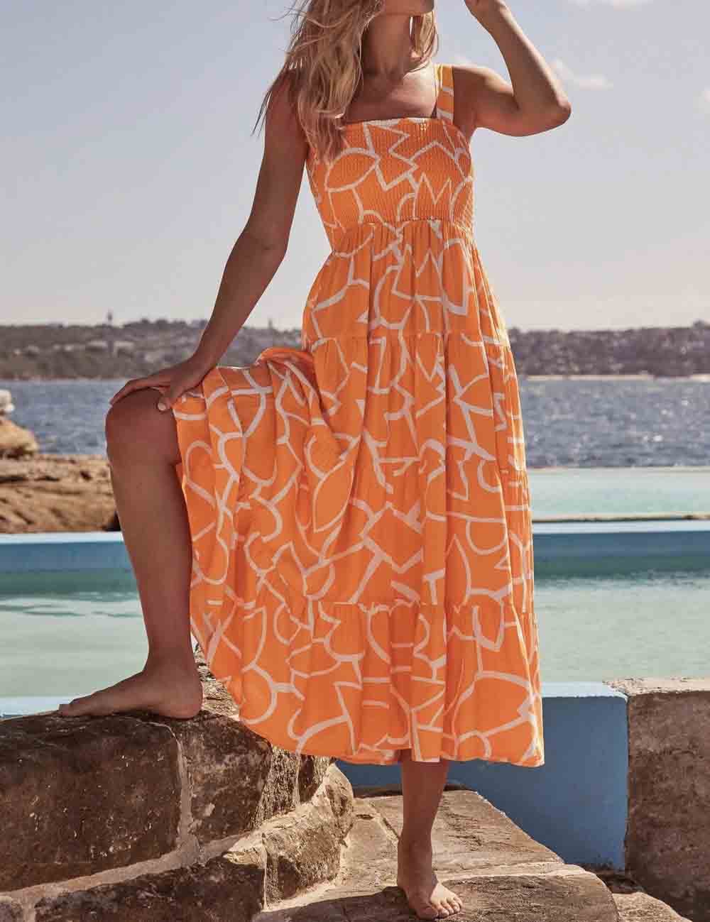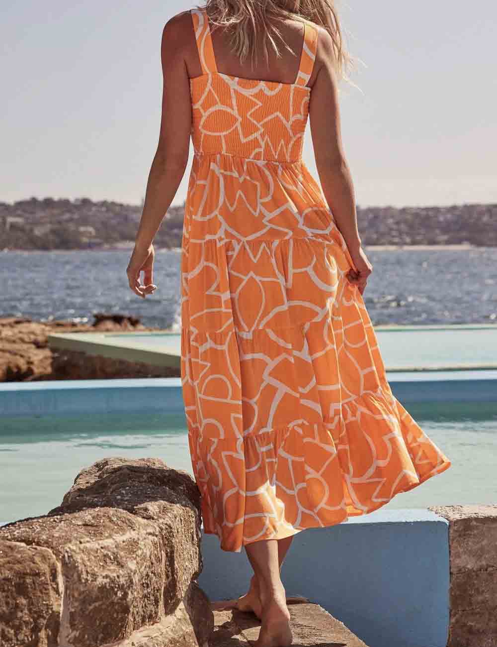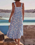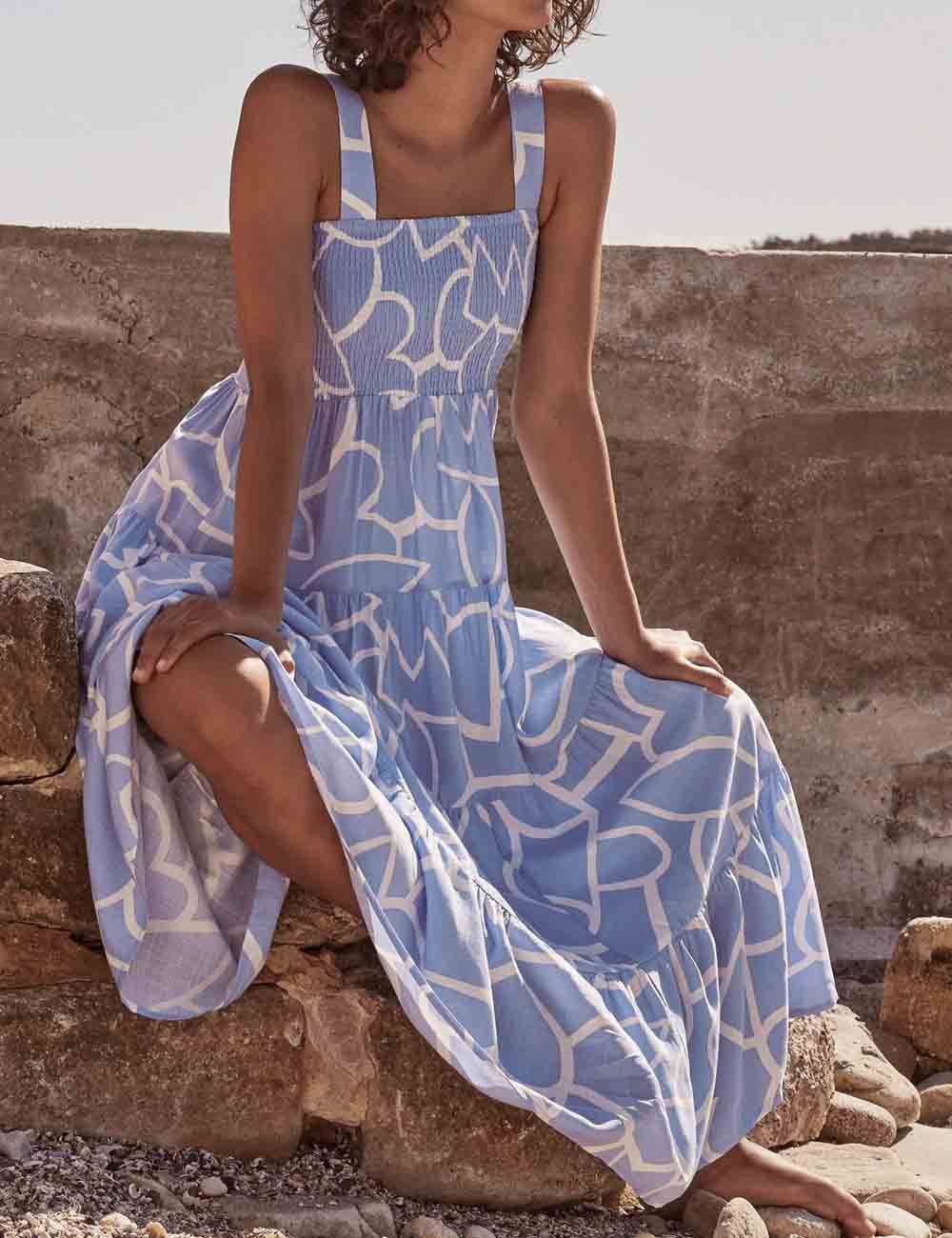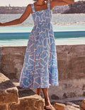 Ladies Color Block Print Back Smocking Midi Dress SKD51117