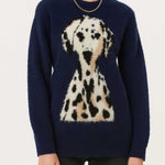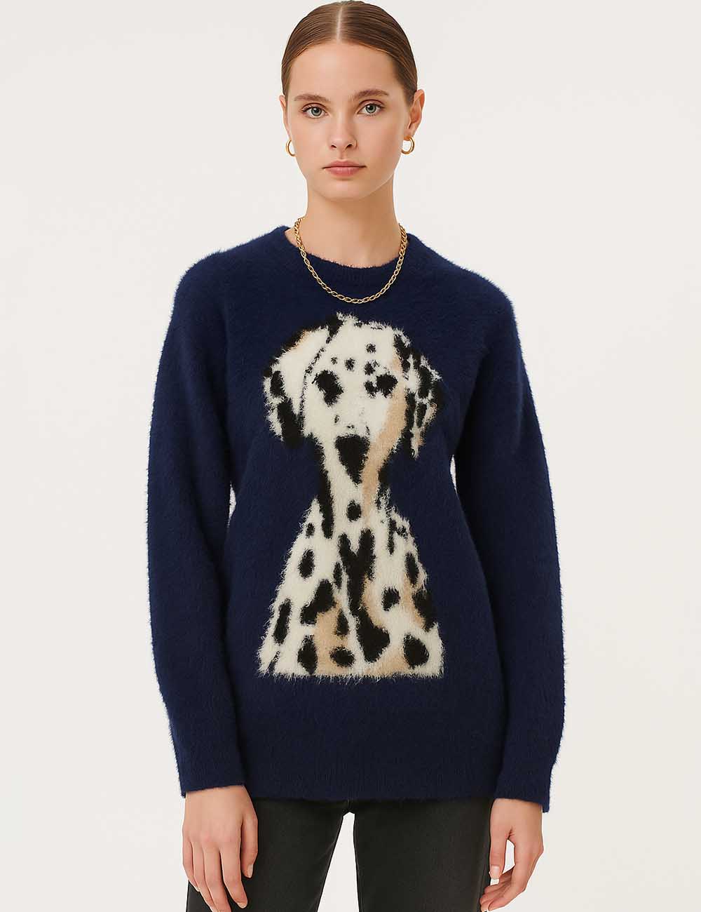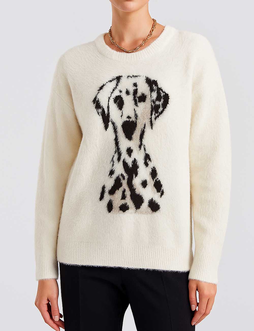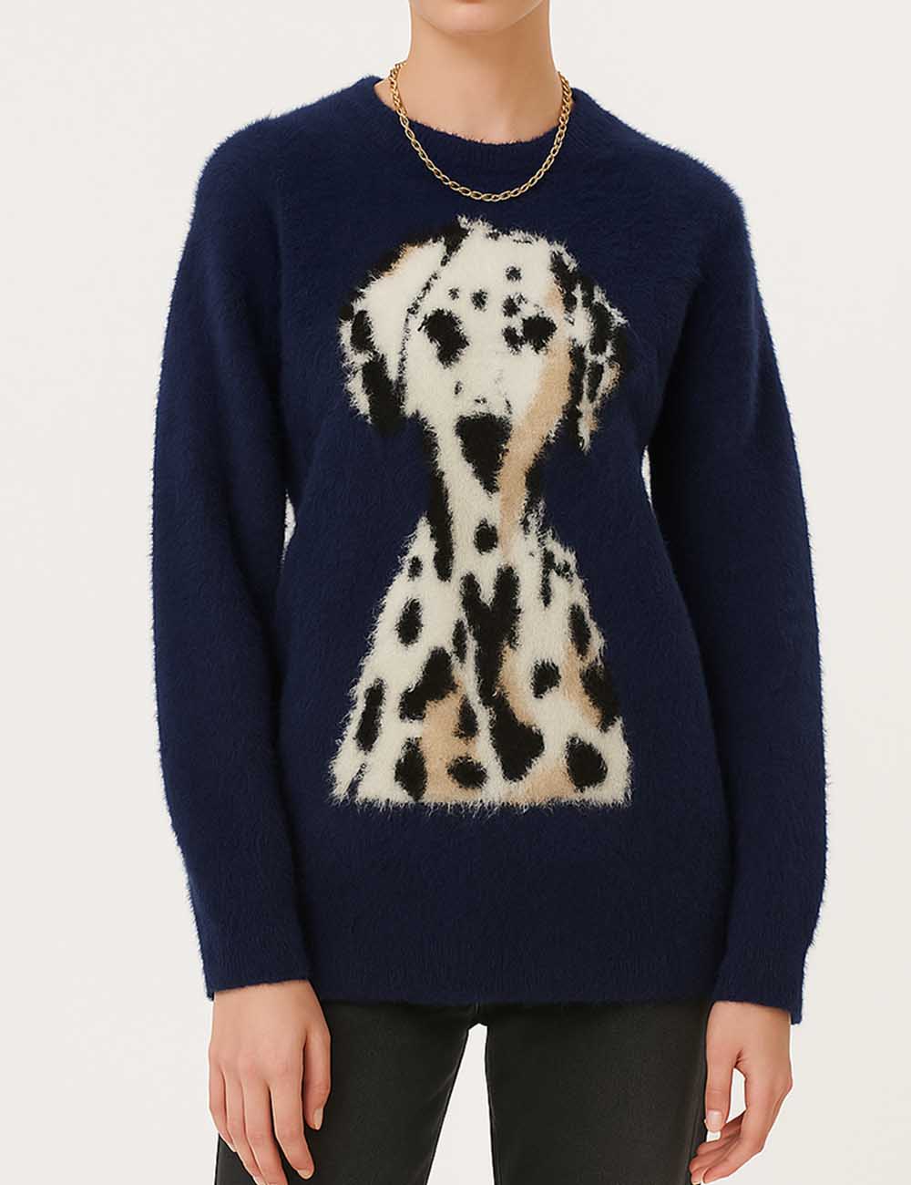 Ladies Color Block Pullover Spotted Dog Pattern Long Sleeves Sweater