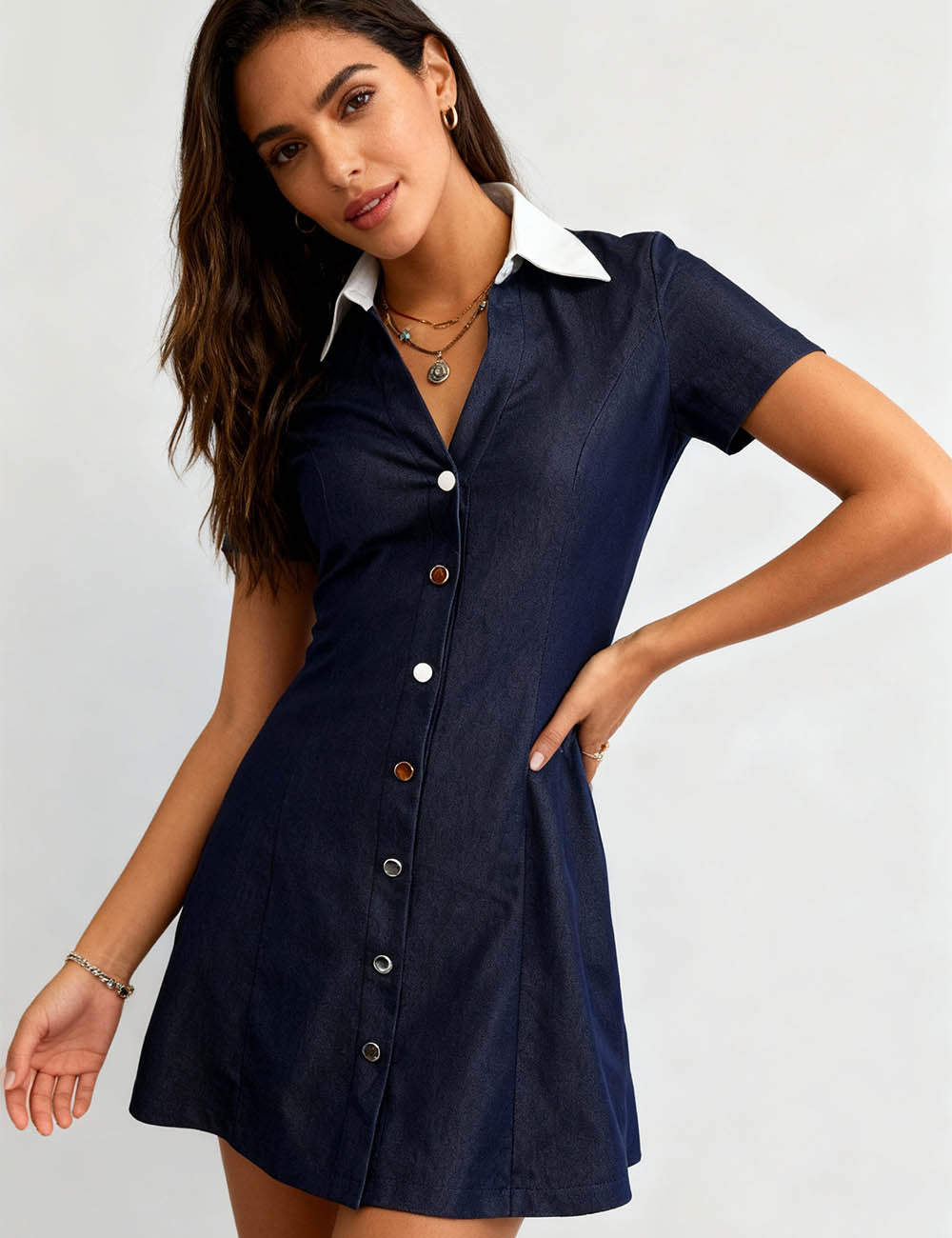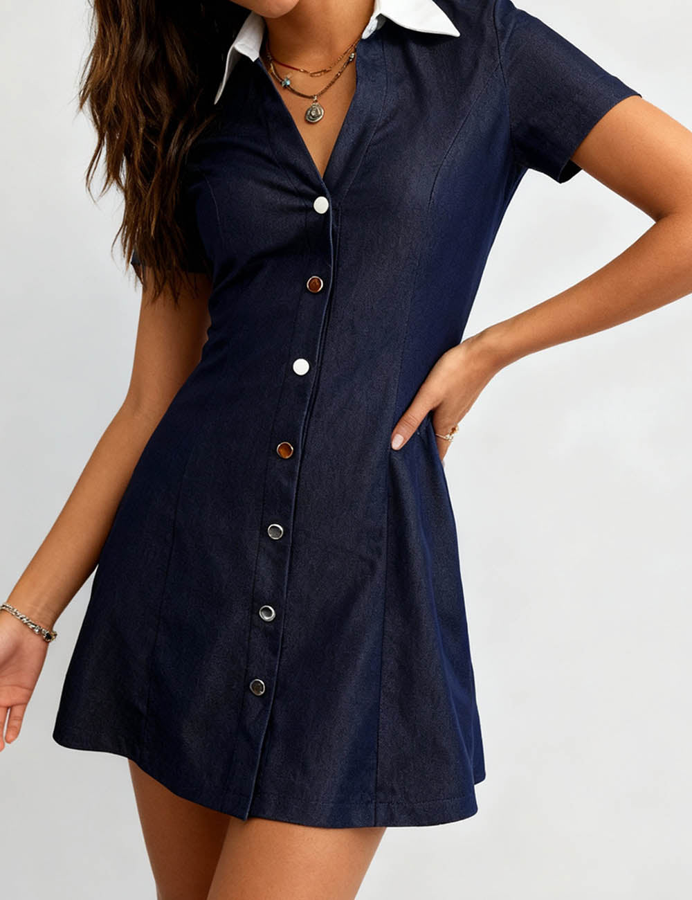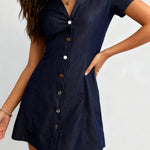 Ladies Color Block V-Neck Button Front Shirt Mini Dress
