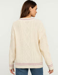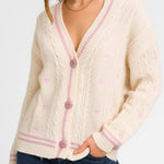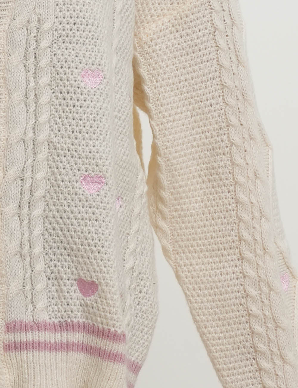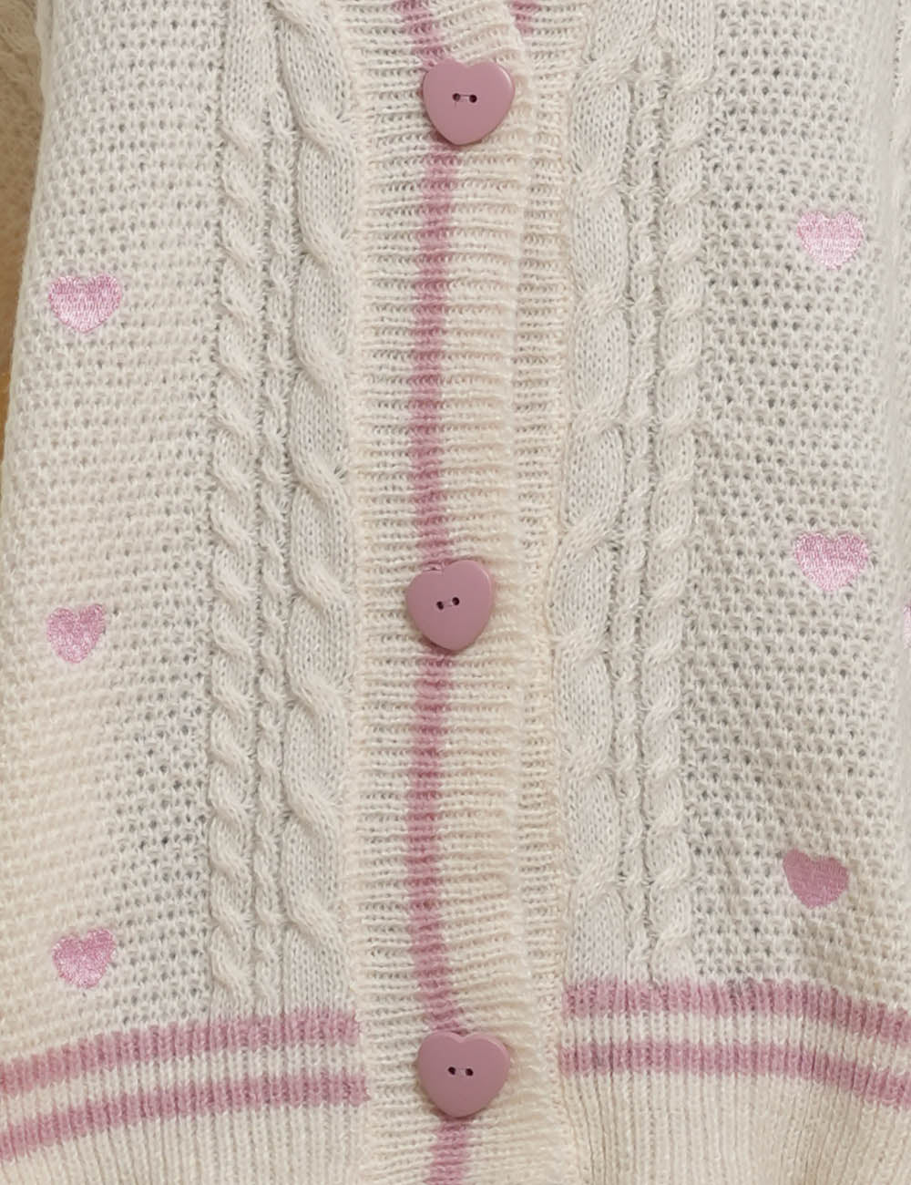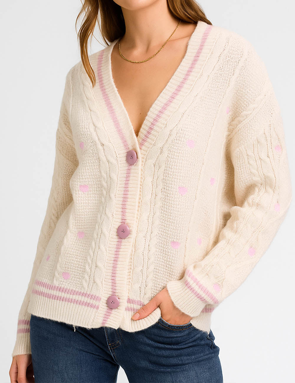 Ladies Color Block V-Neck Heart Embroidery Button Cardigan