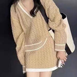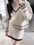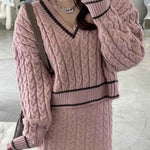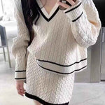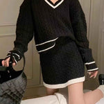 Ladies Color Block V-Neck Long Sleeves Top & Skirt Set