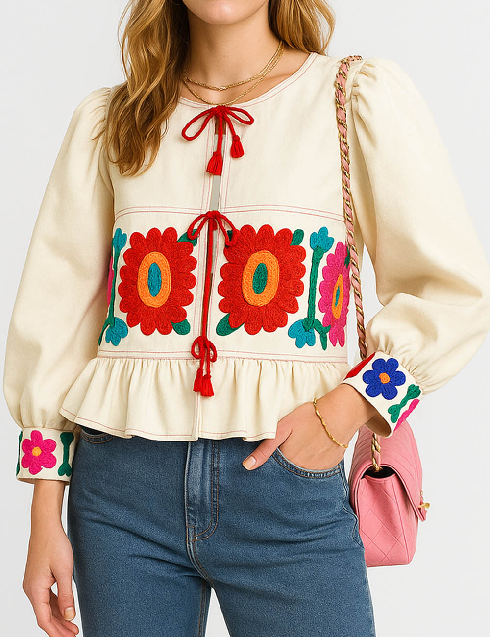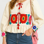 Ladies Colorful Floral Pattern Tie Front Ruffle Hem Top