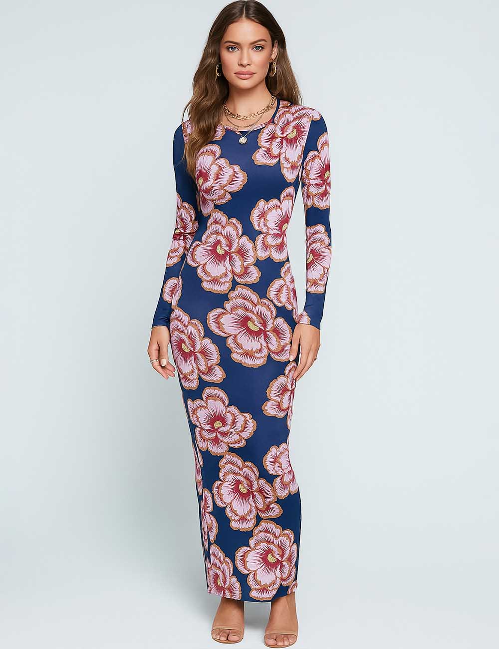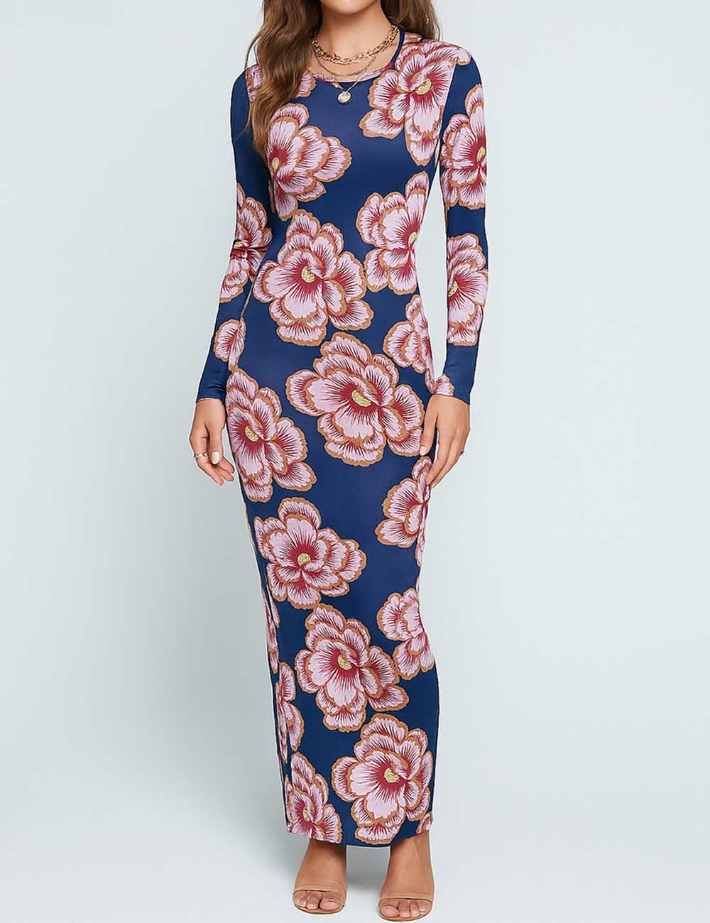Ladies Contrast Floral Print Pullover Hip Wrap Maxi Dress